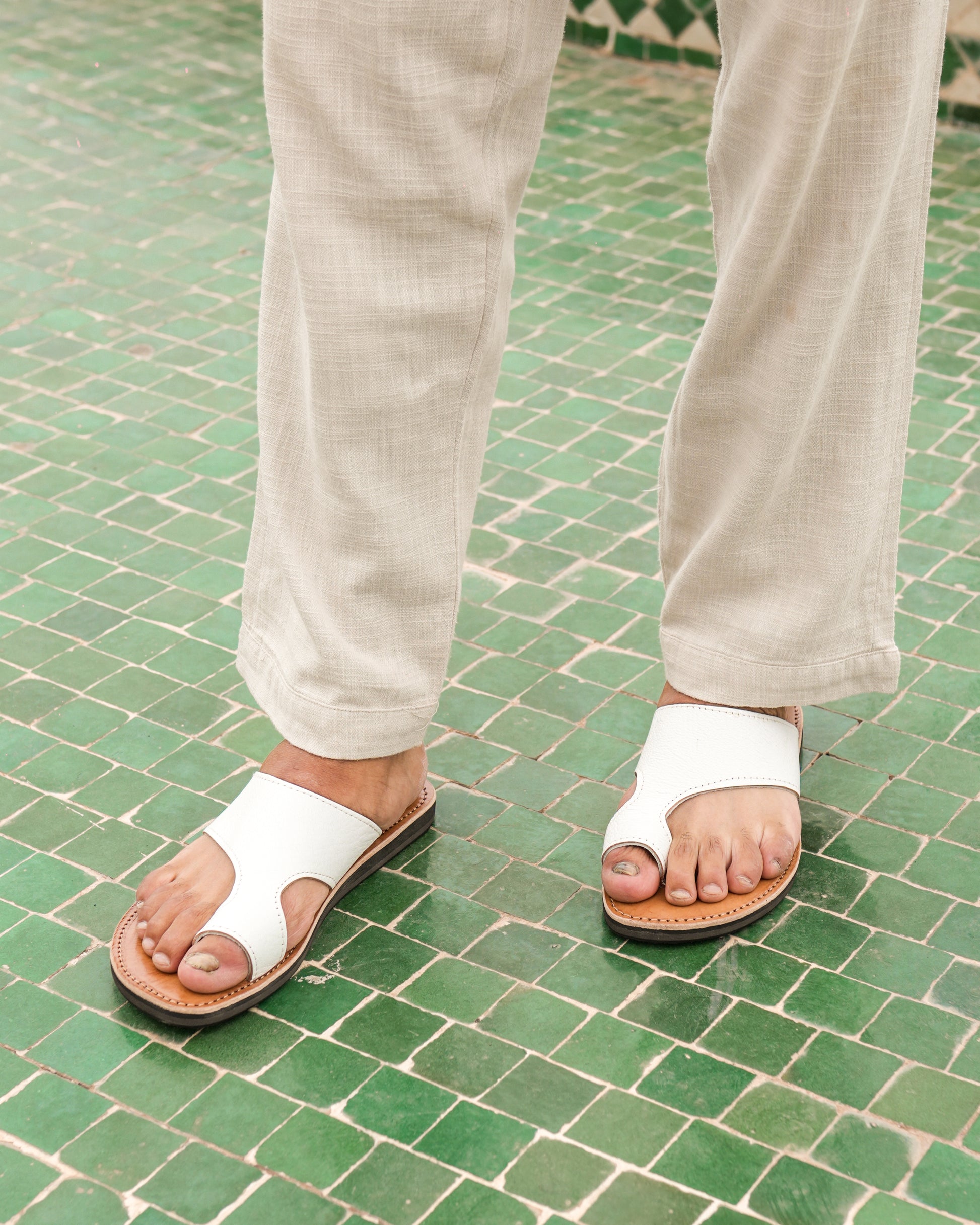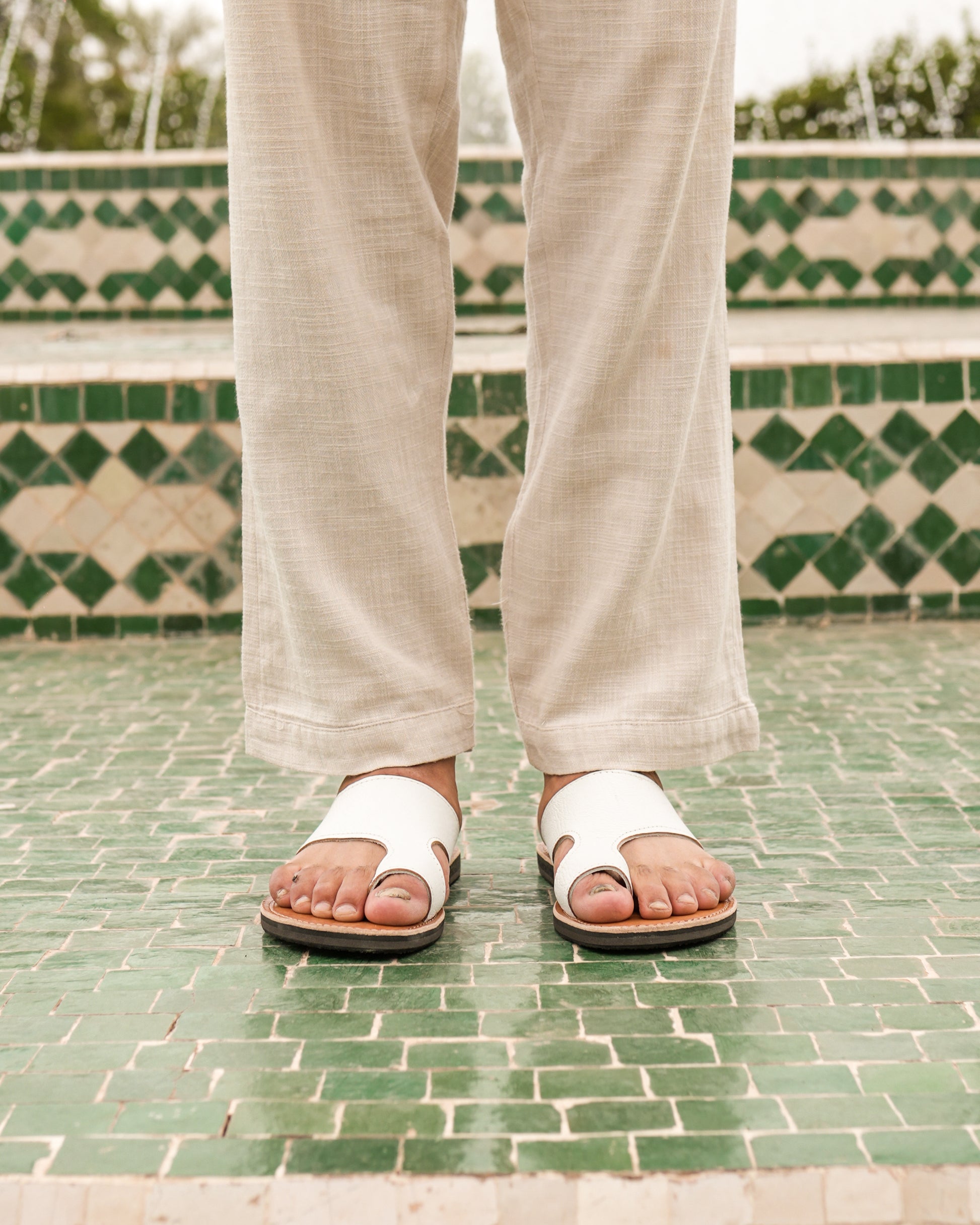 Clean, crisp, and handcrafted. These white leather sandals are made in Marrakech using premium full-grain leather and a flexible rubber sole. The wide strap and toe loop offer a secure, comfortable fit with a standout minimal design.