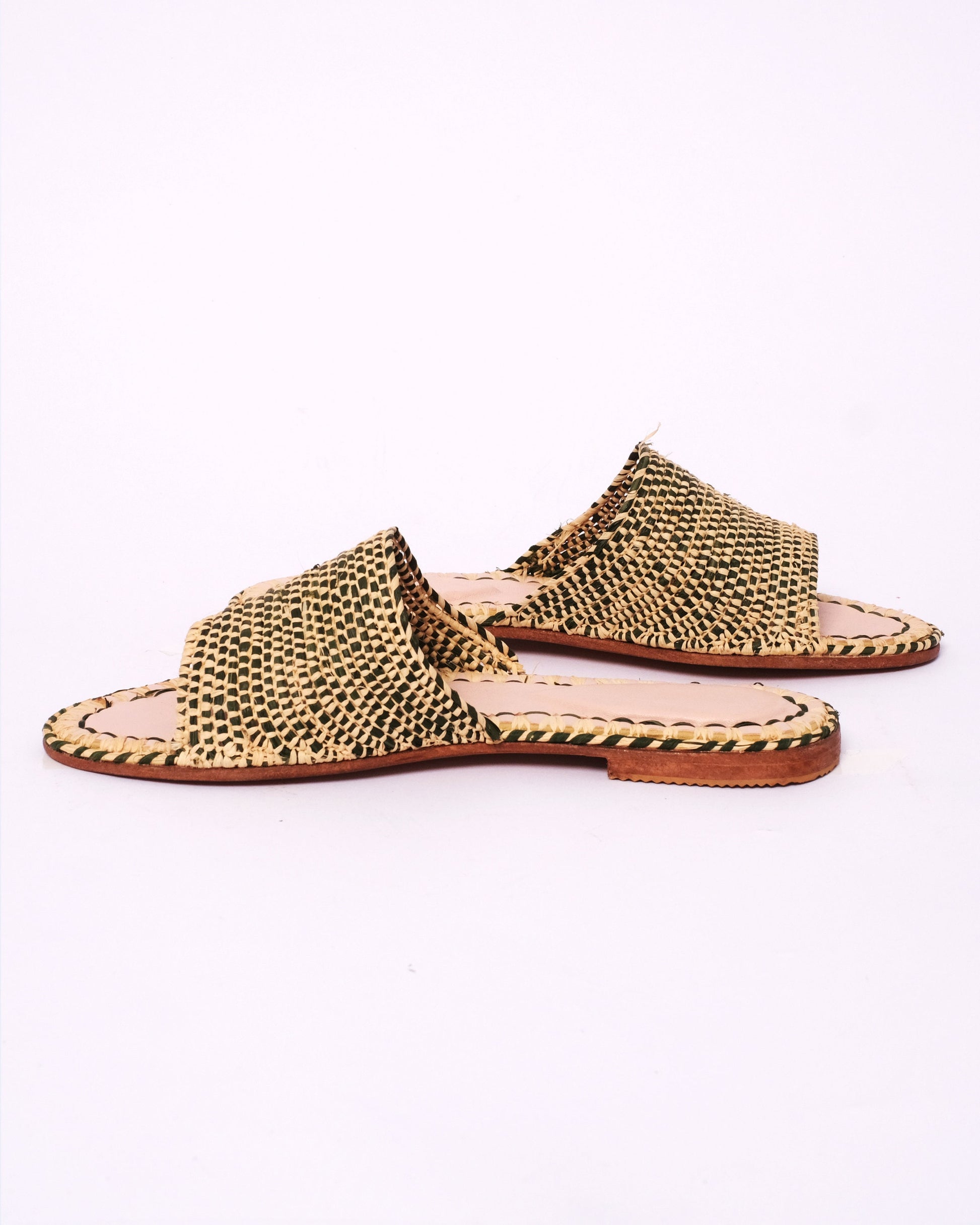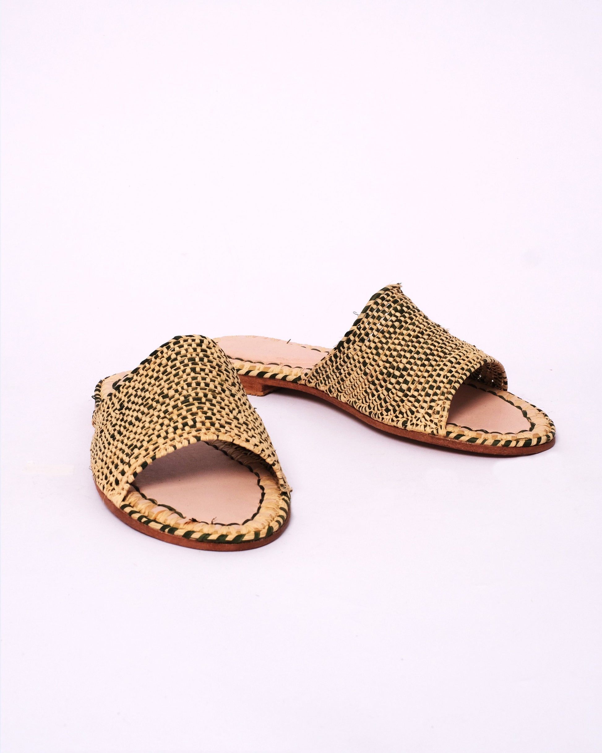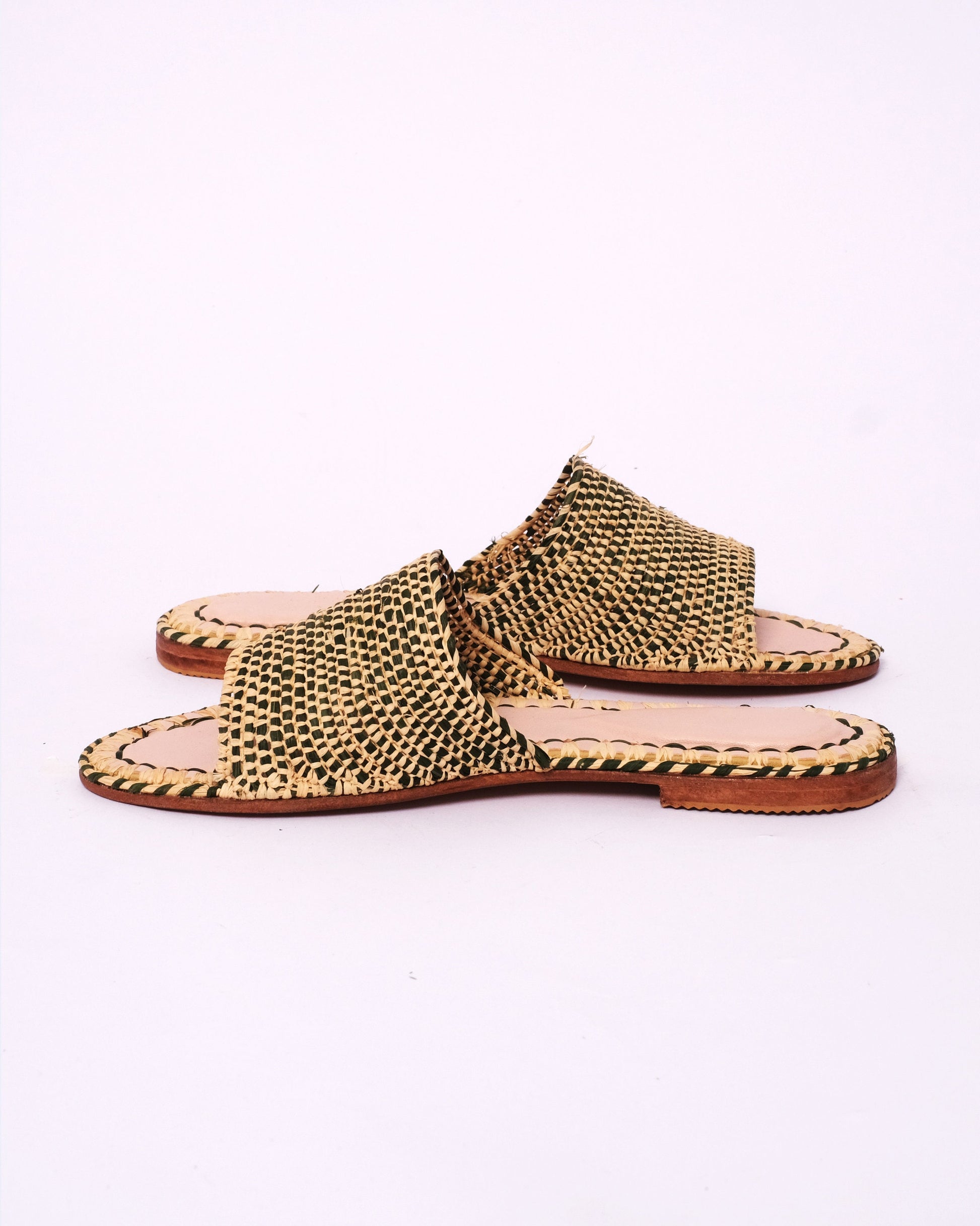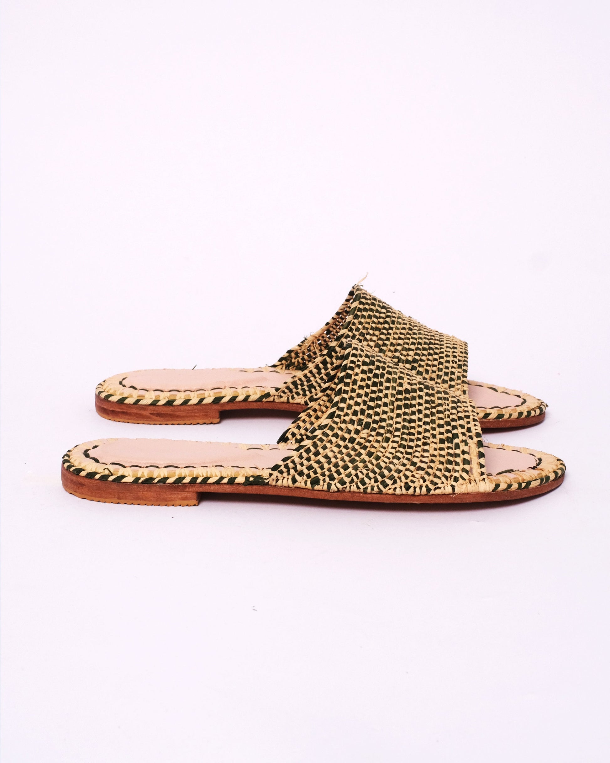 - Handwoven Raffia Upper – Natural and black for visual depth