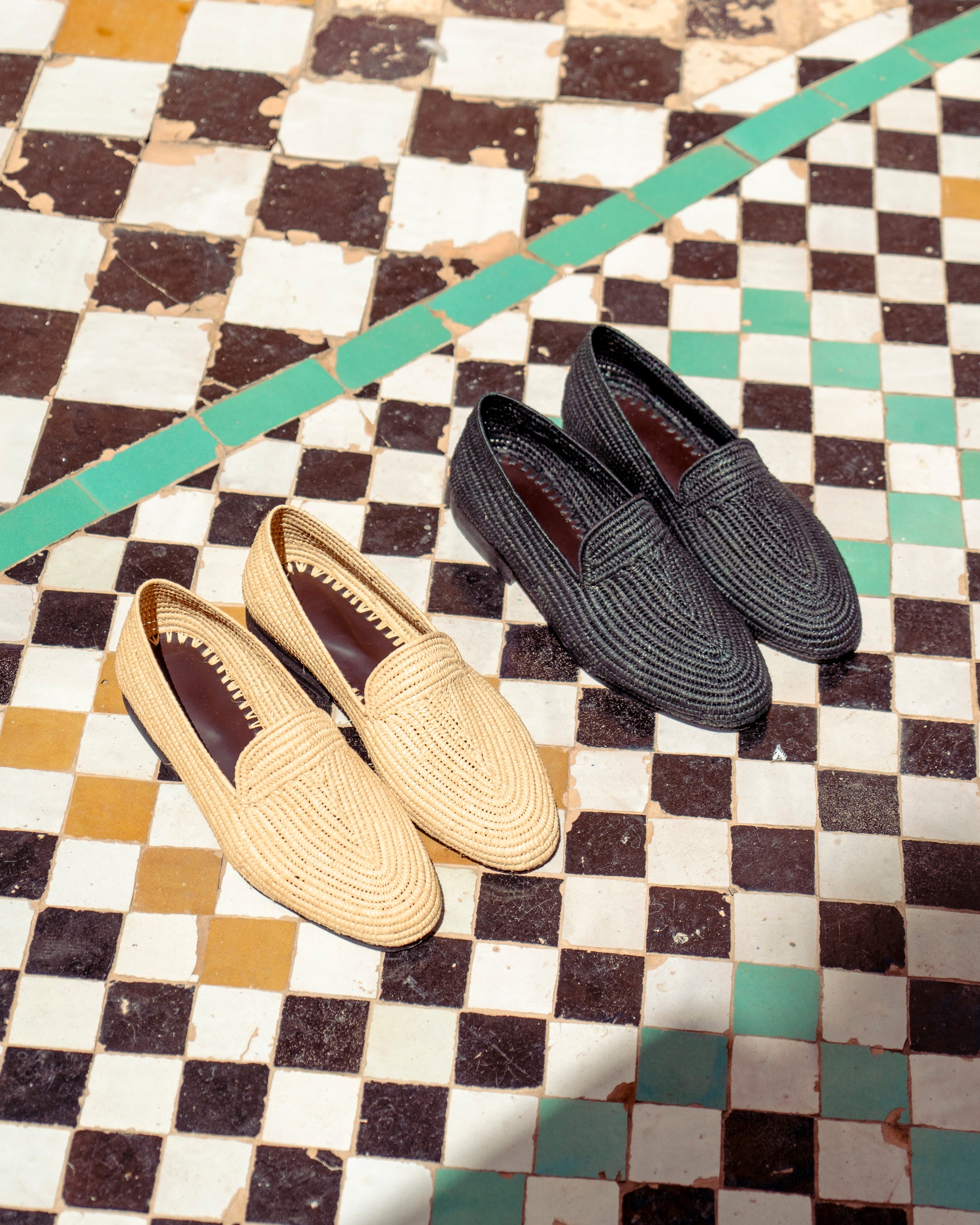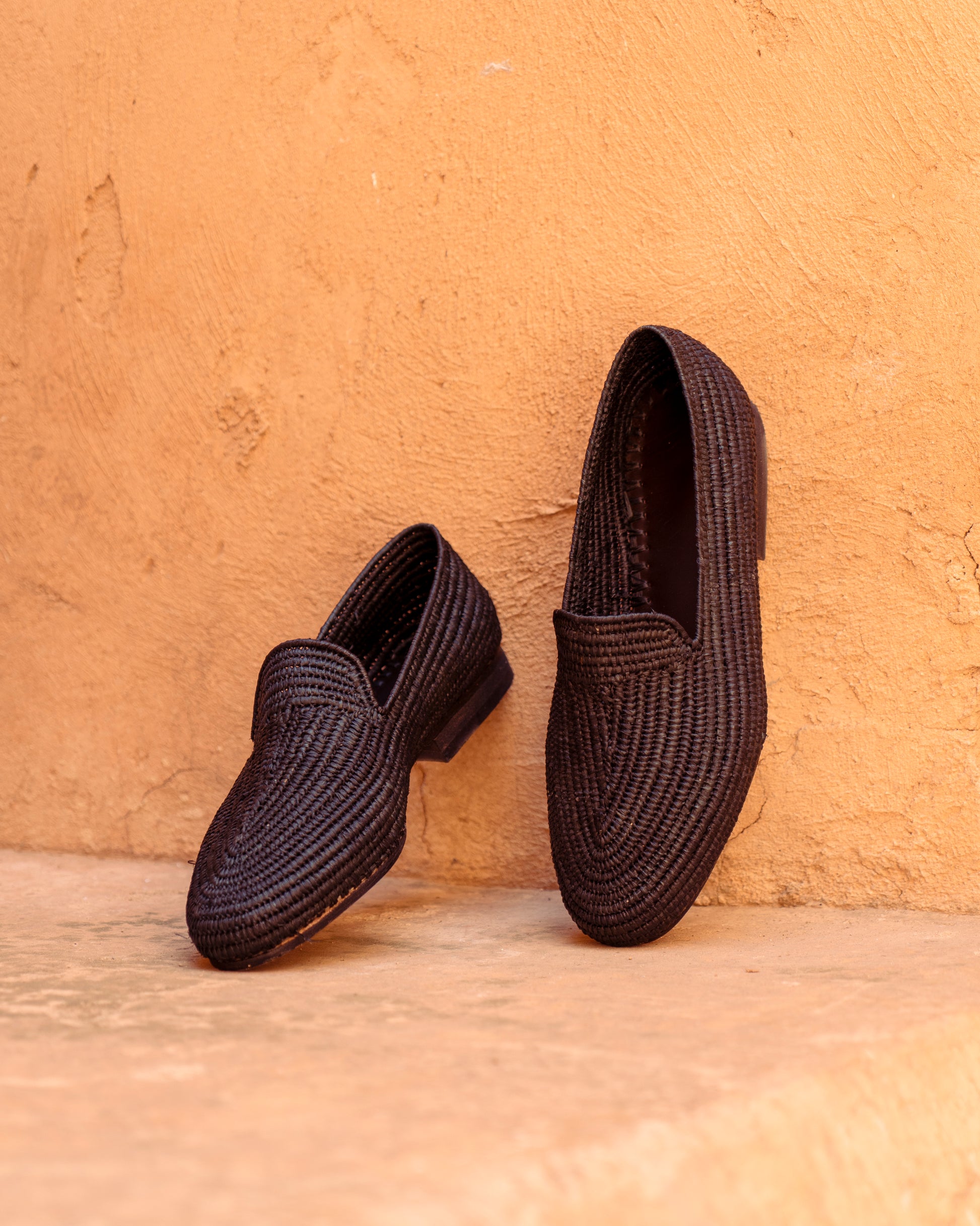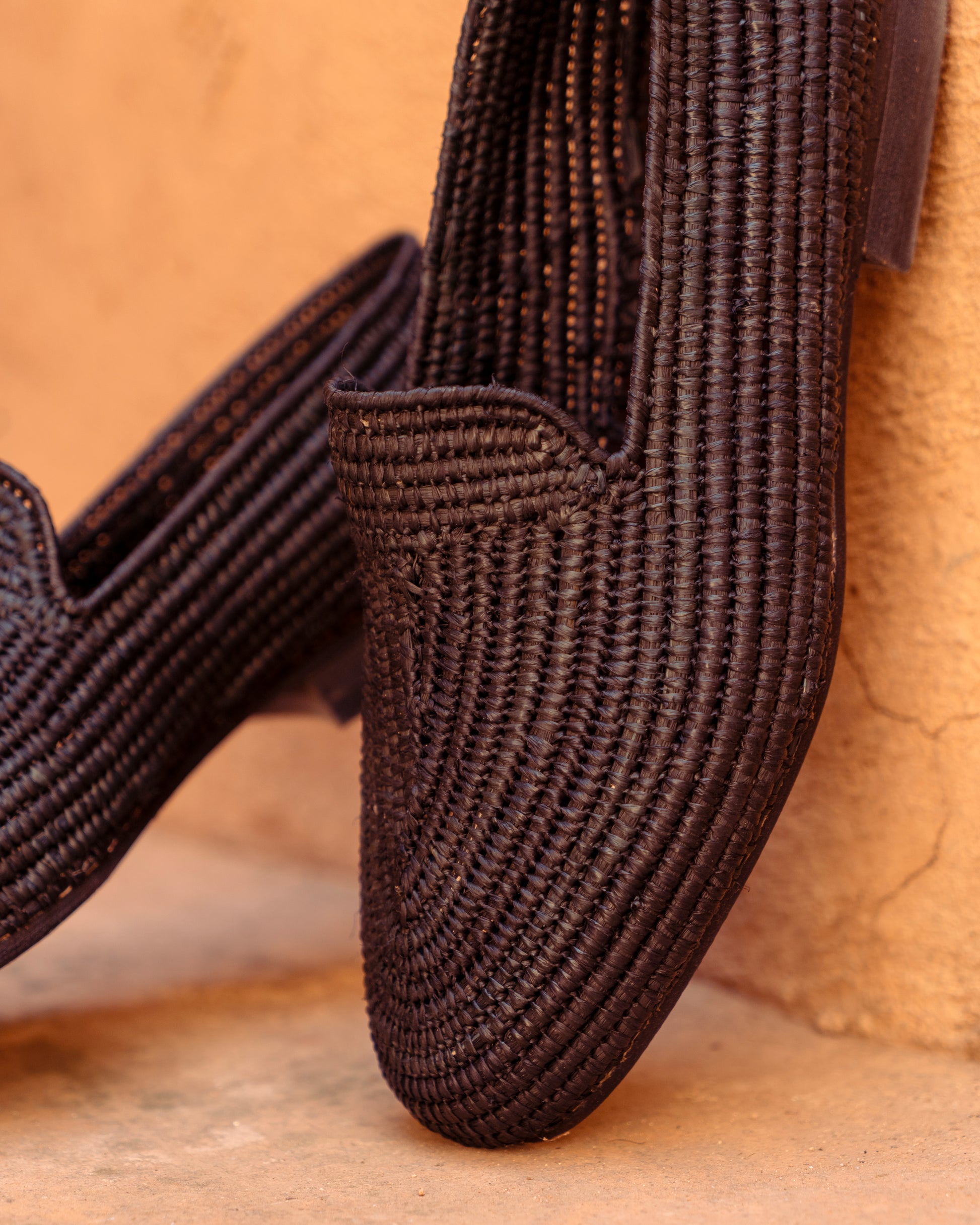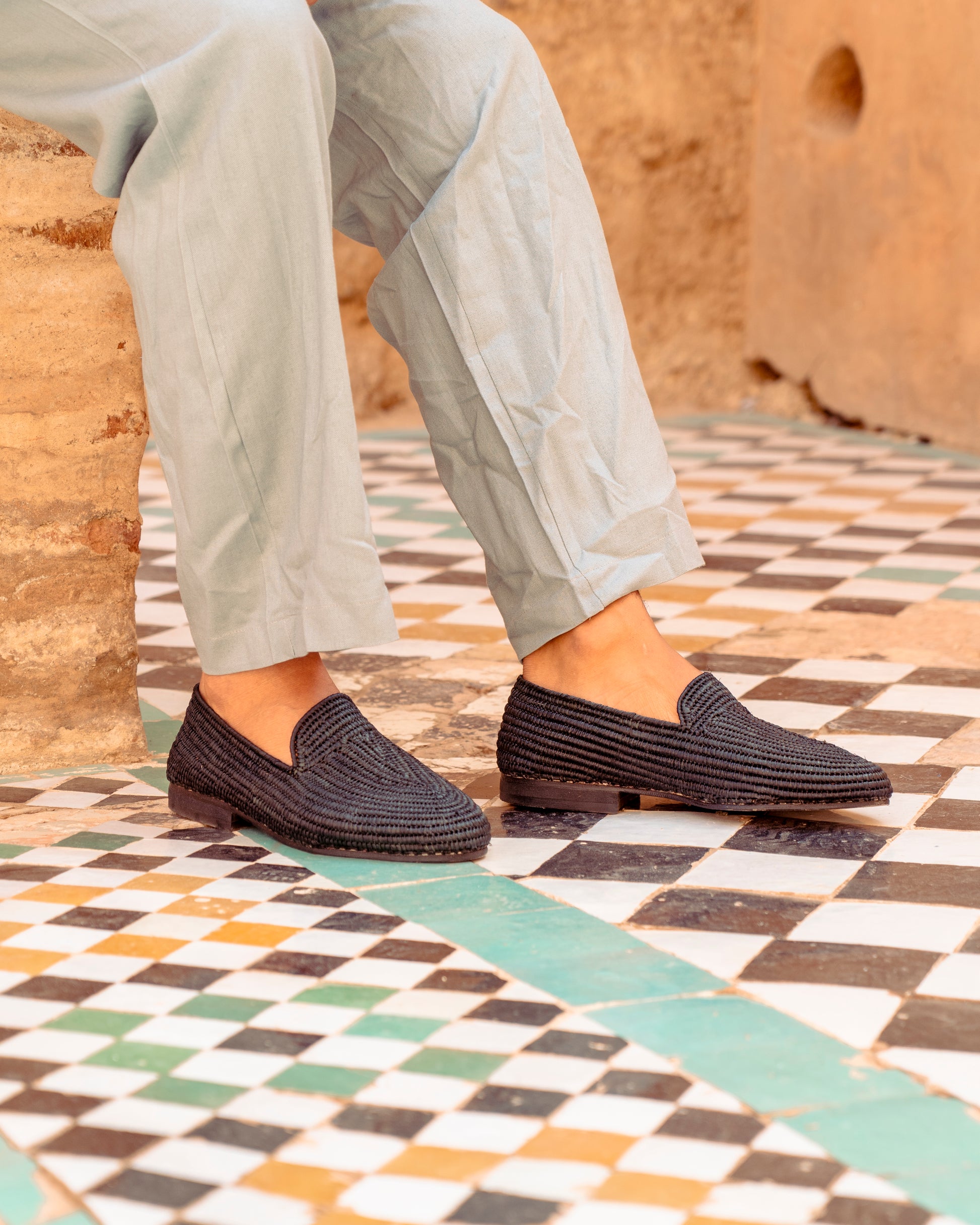 Subtle, sleek, and handcrafted to the last detail. These matte black raffia loafers are woven by hand in Marrakech using natural raffia fibers, offering a refined minimalist look with a lightweight feel.