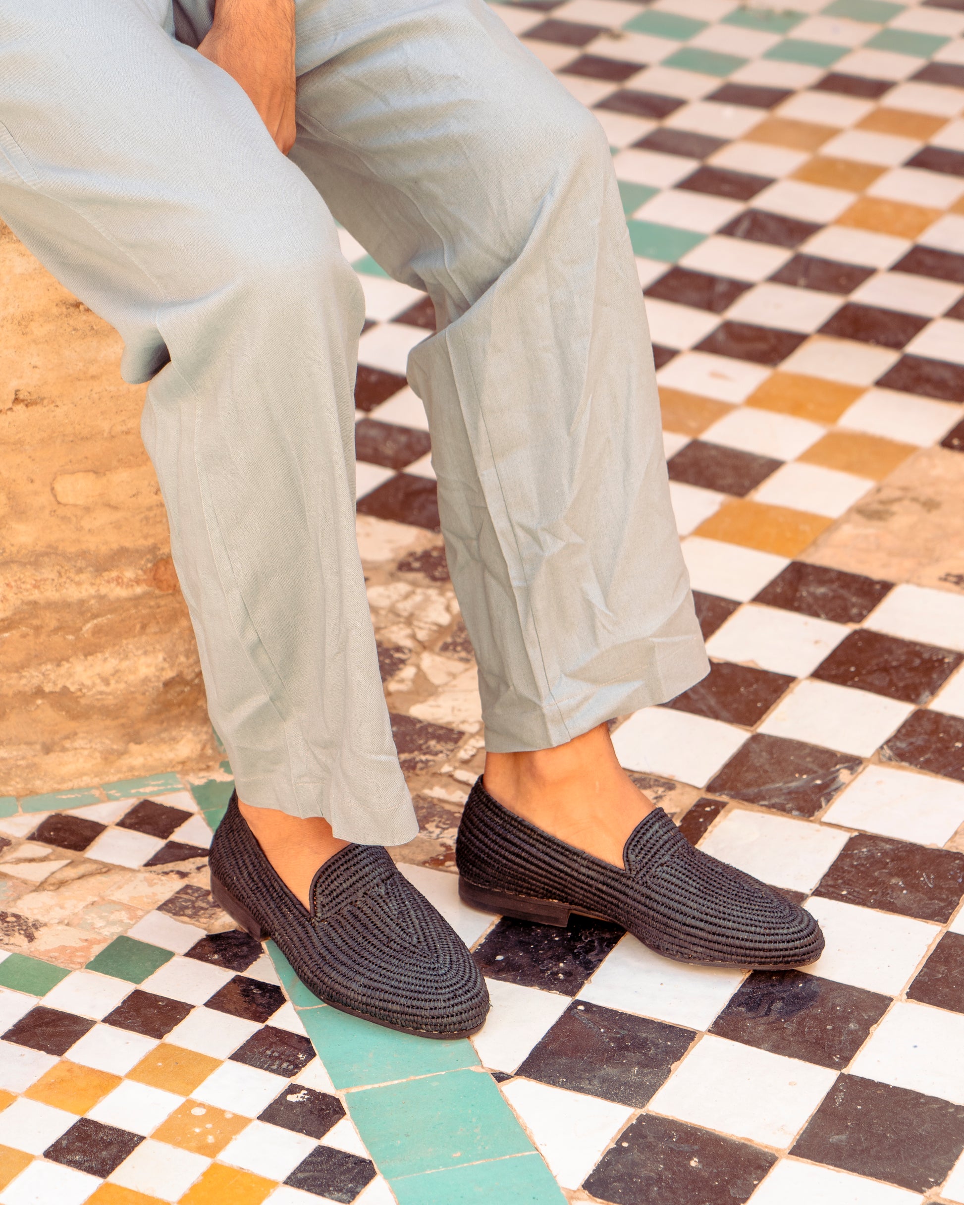 Black Raffia Loafers for Men – Handwoven Moroccan Slip-On Dress Shoes