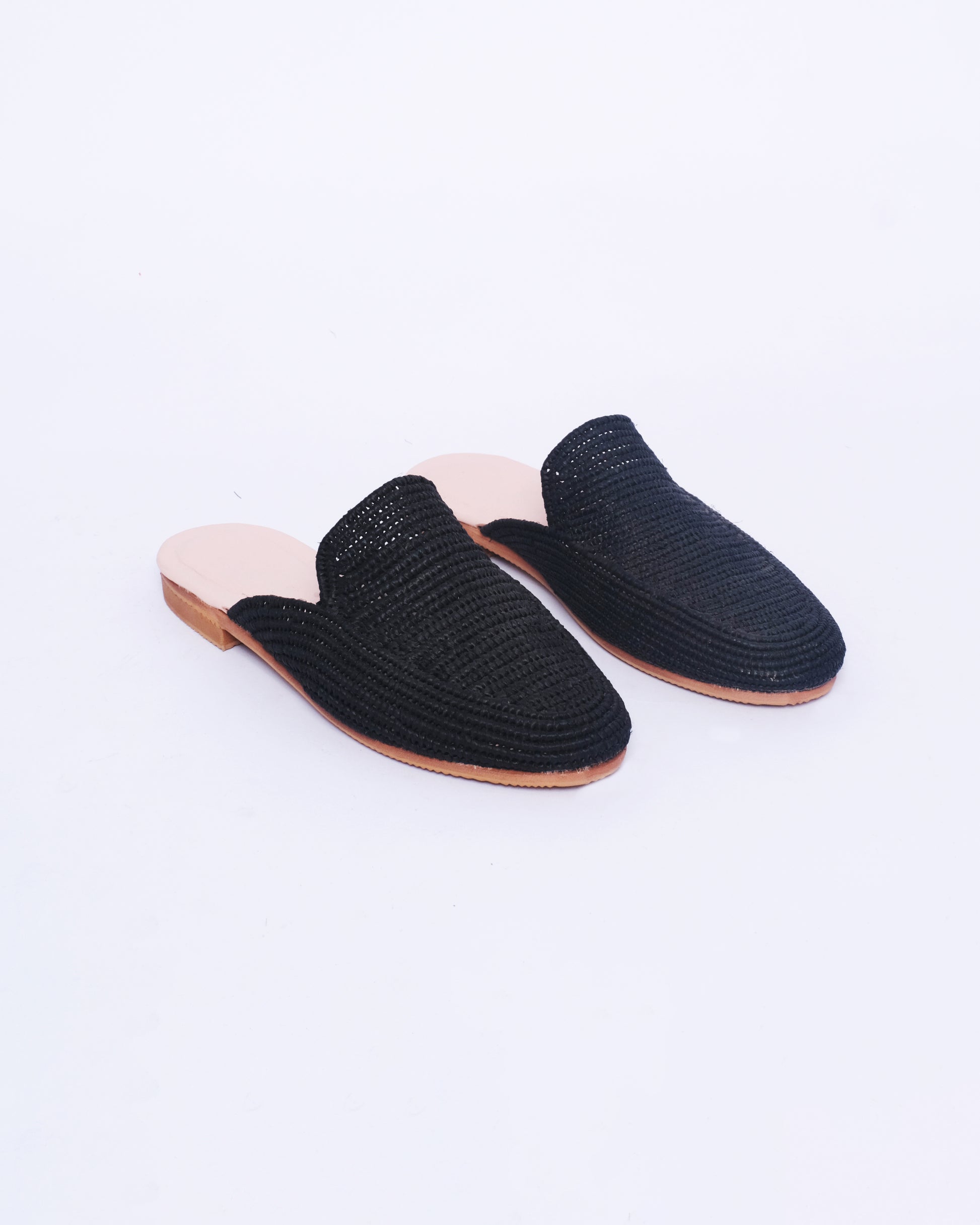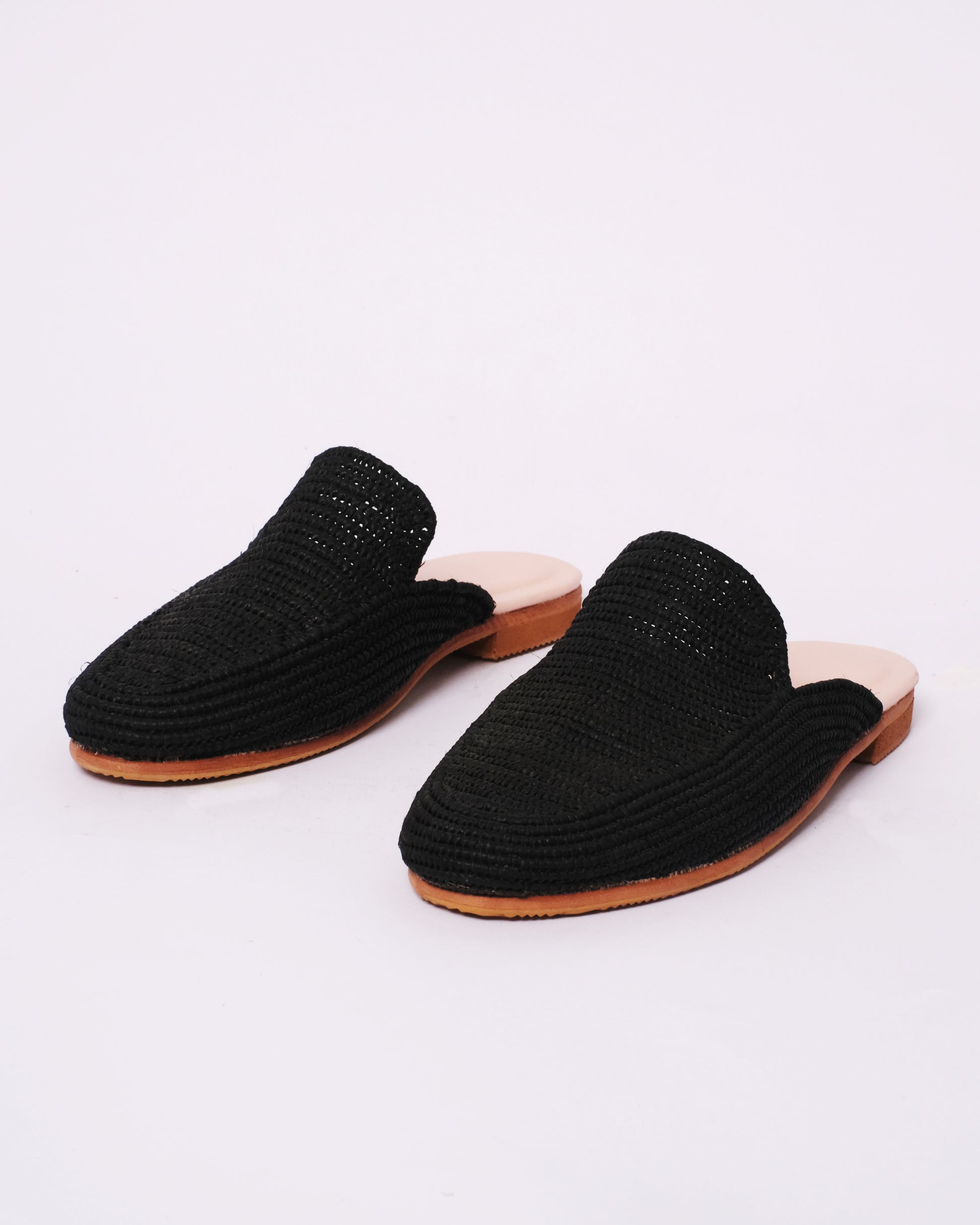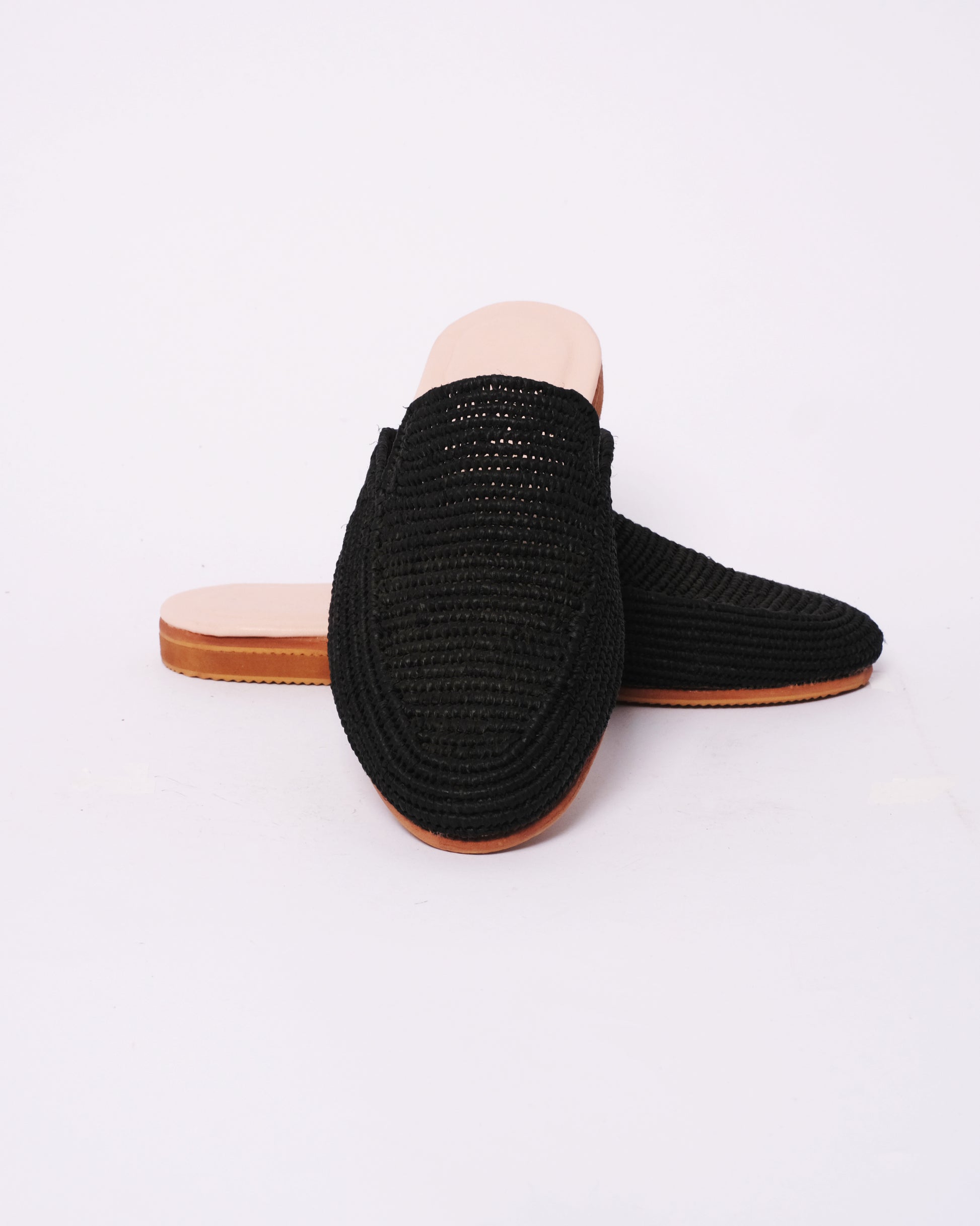 Minimalist, elegant, and built for comfort. These black raffia mules are handmade by Moroccan artisans using natural raffia and finished with a durable leather sole. Their clean silhouette, open back, and pointed toe make them a wardrobe essential that pairs effortlessly with everything from linen pants to maxi skirts.