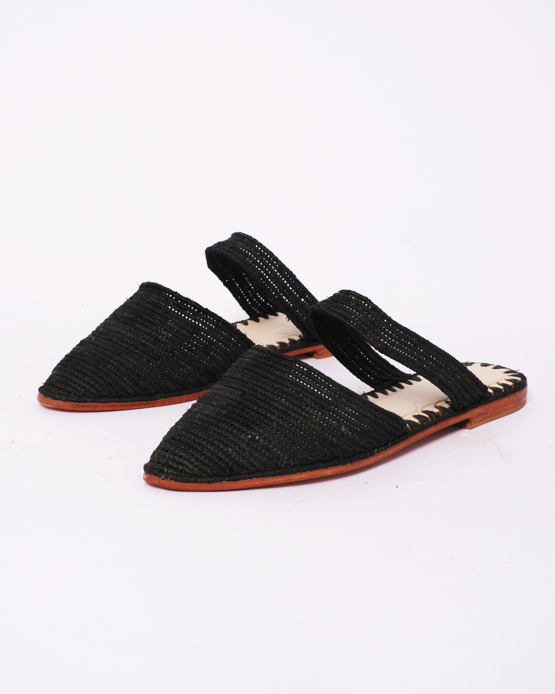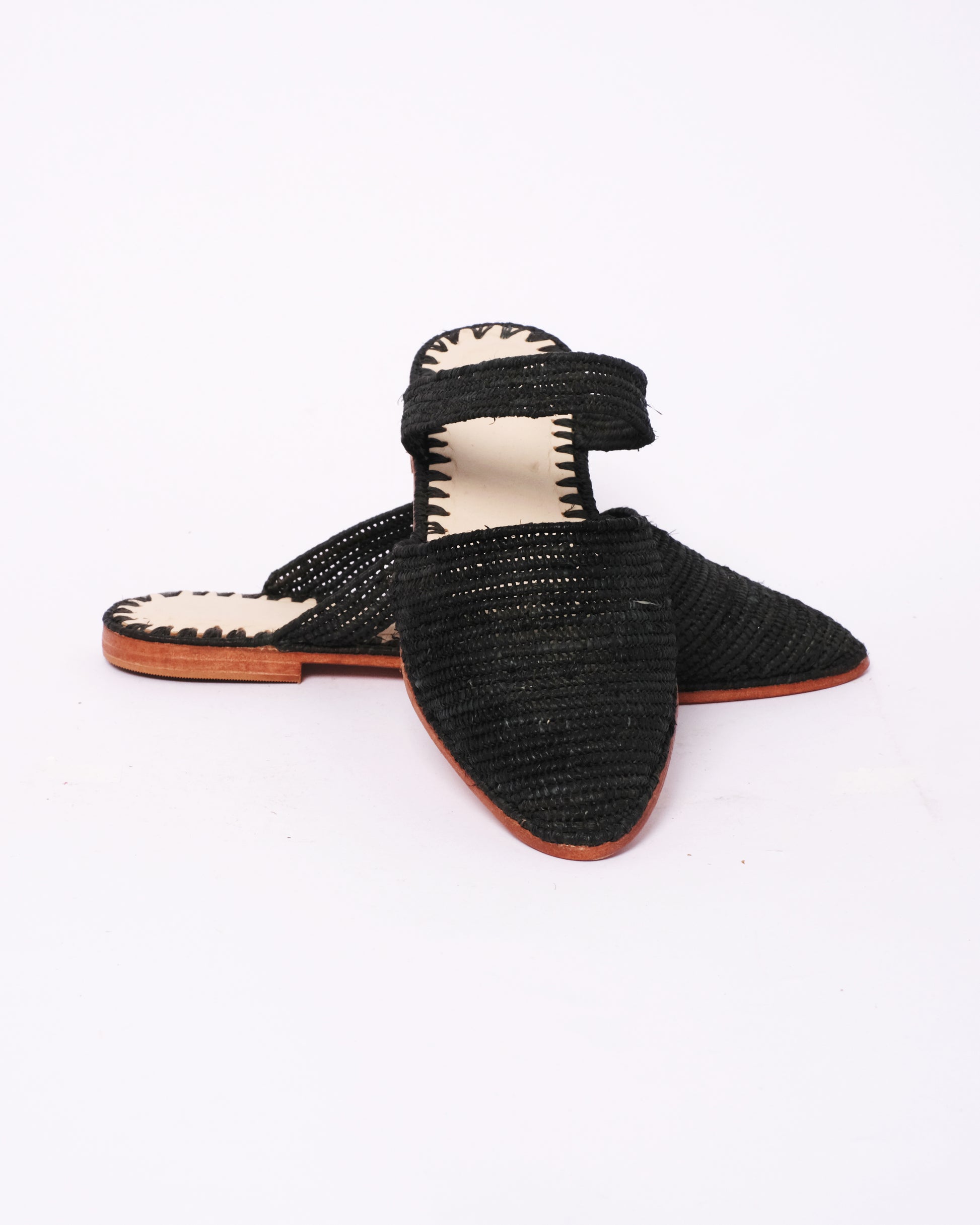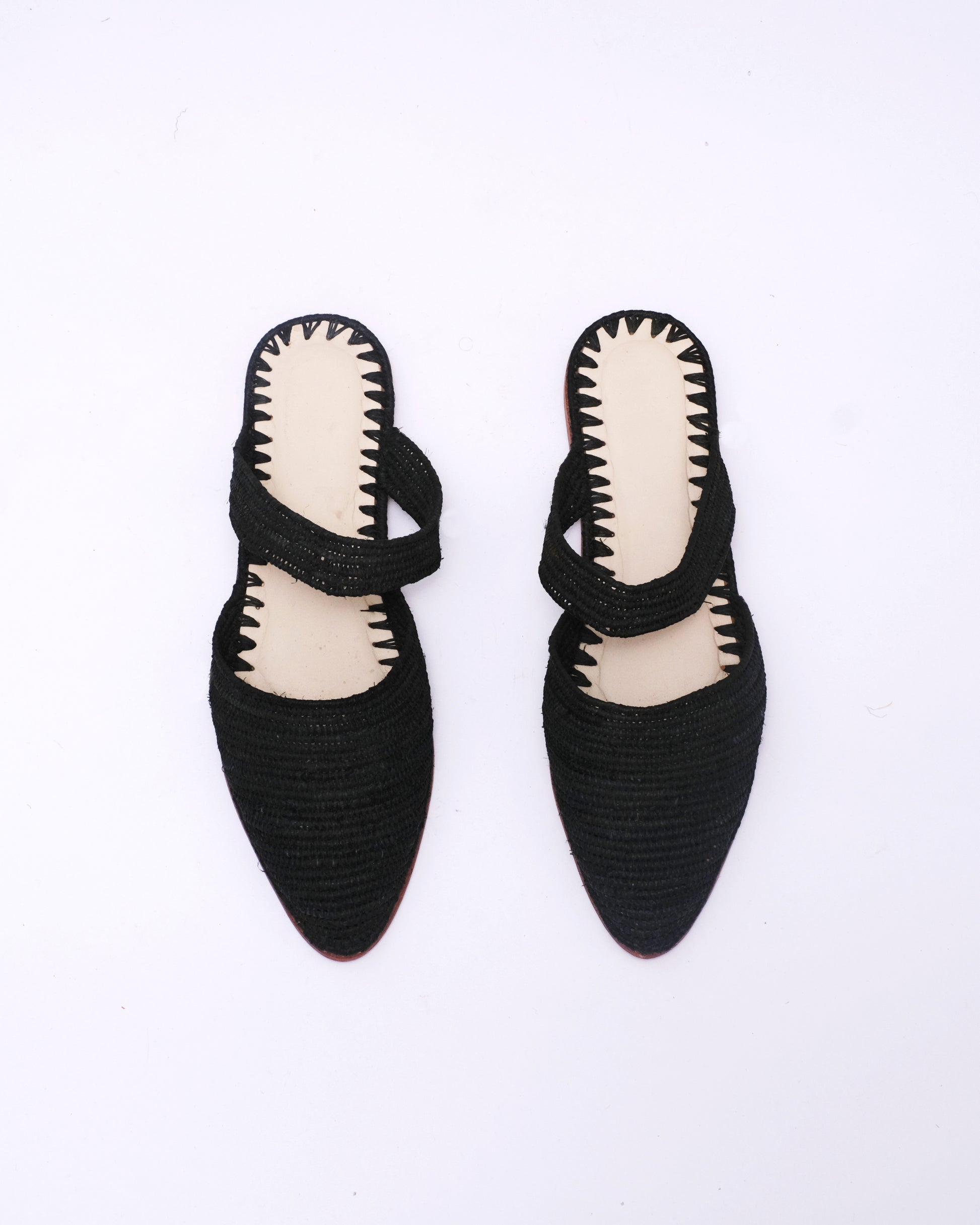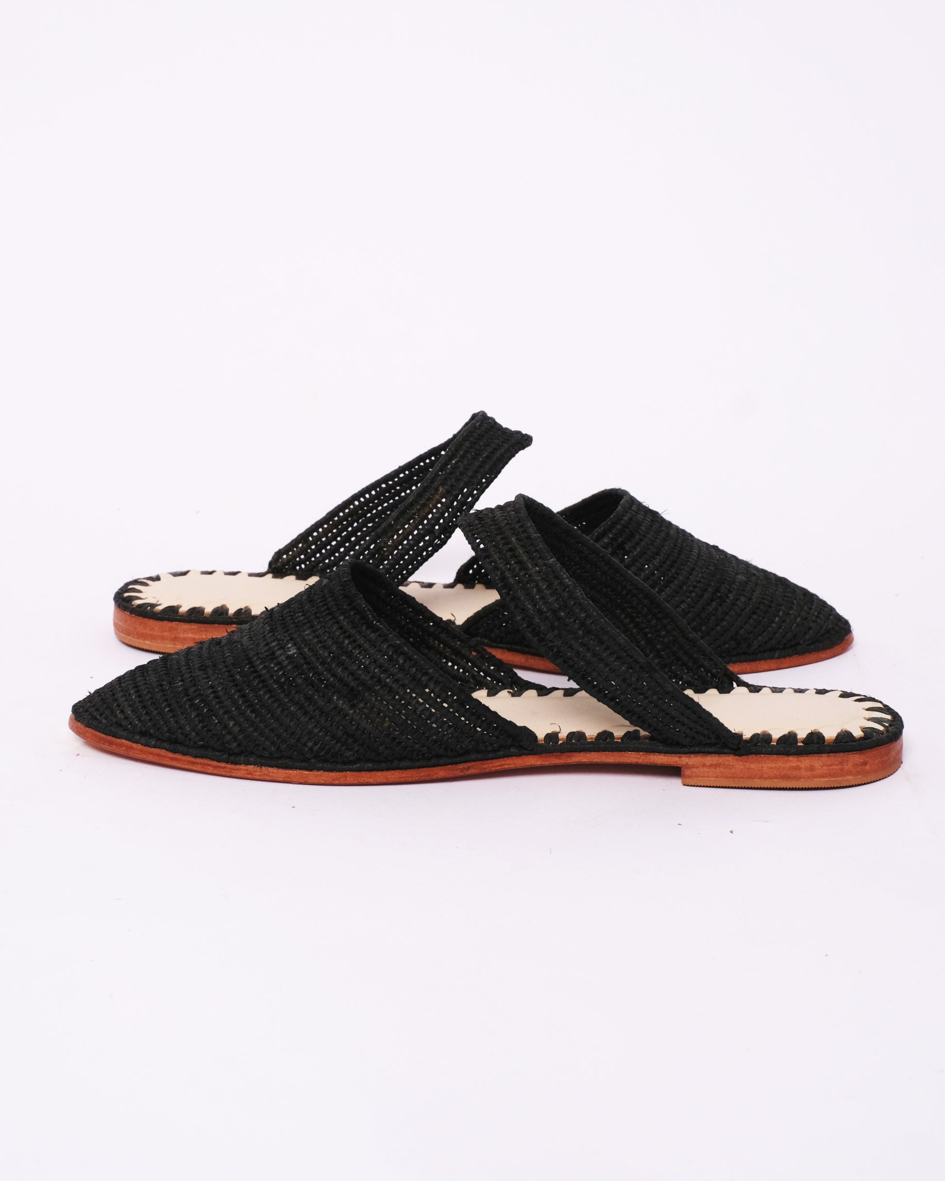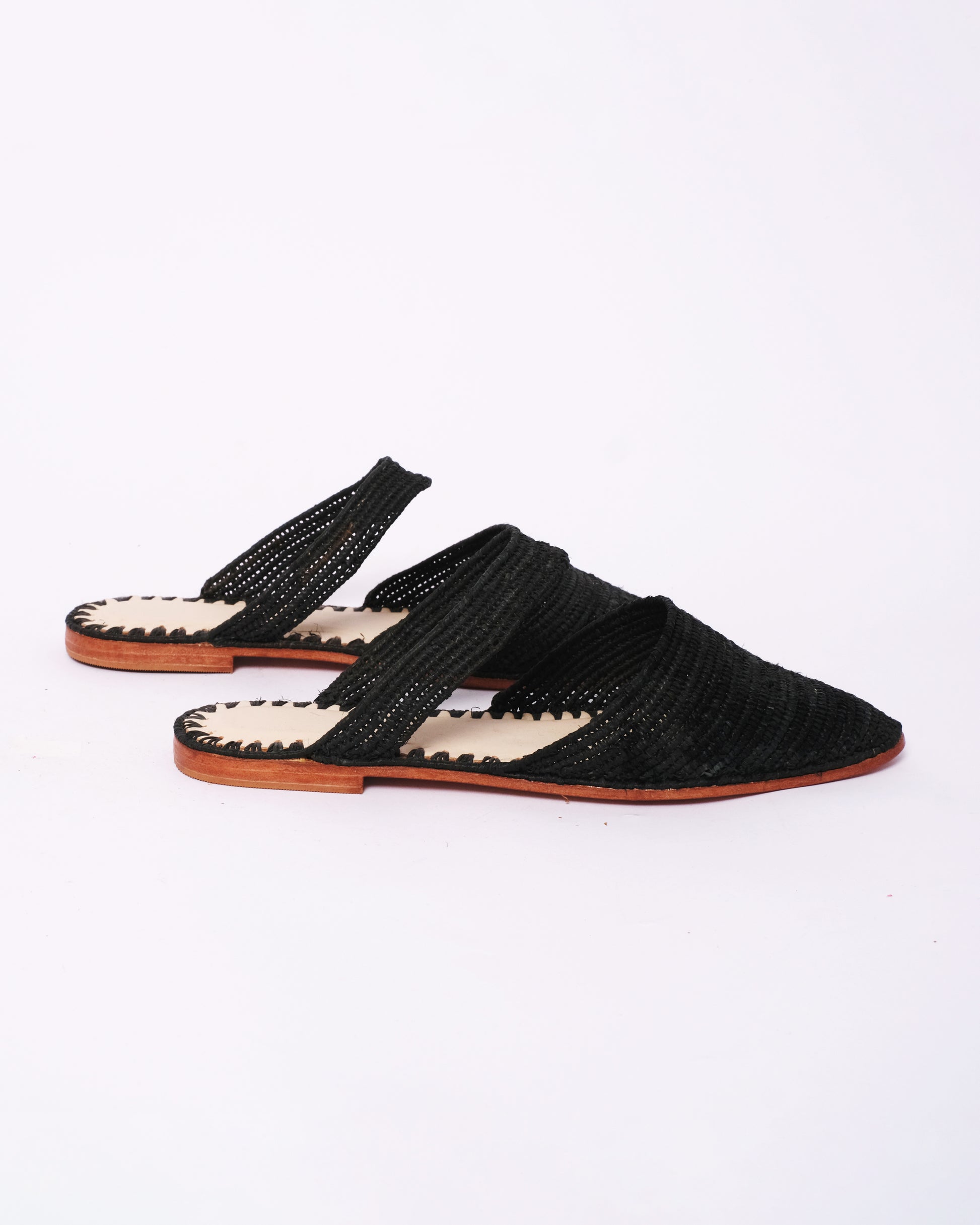 • Black Raffia Upper – Handwoven by Moroccan artisans for texture and strength.