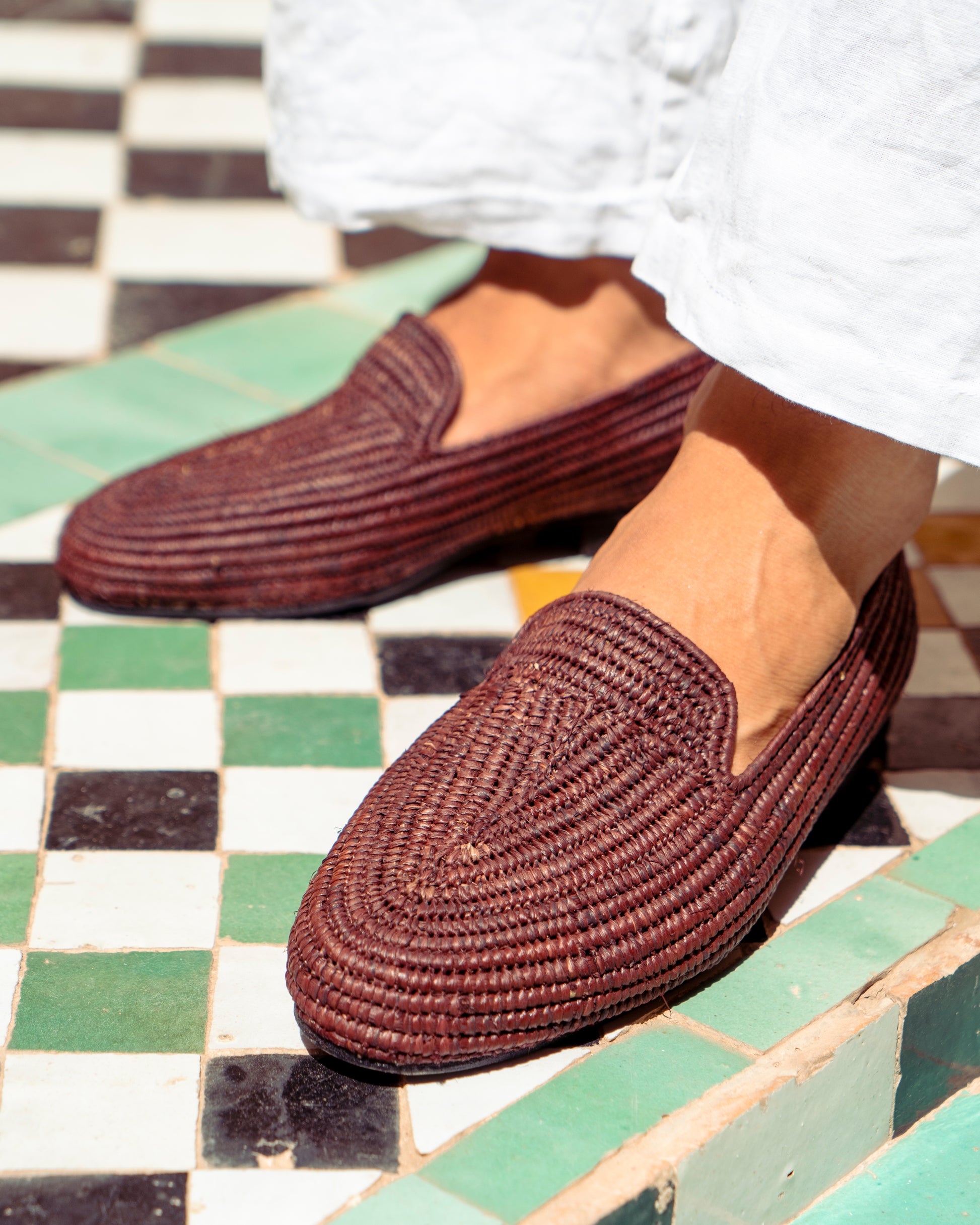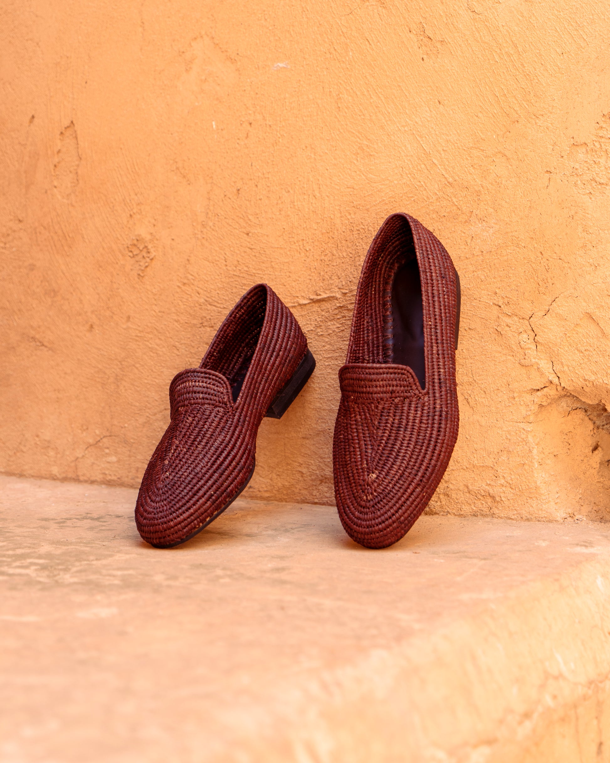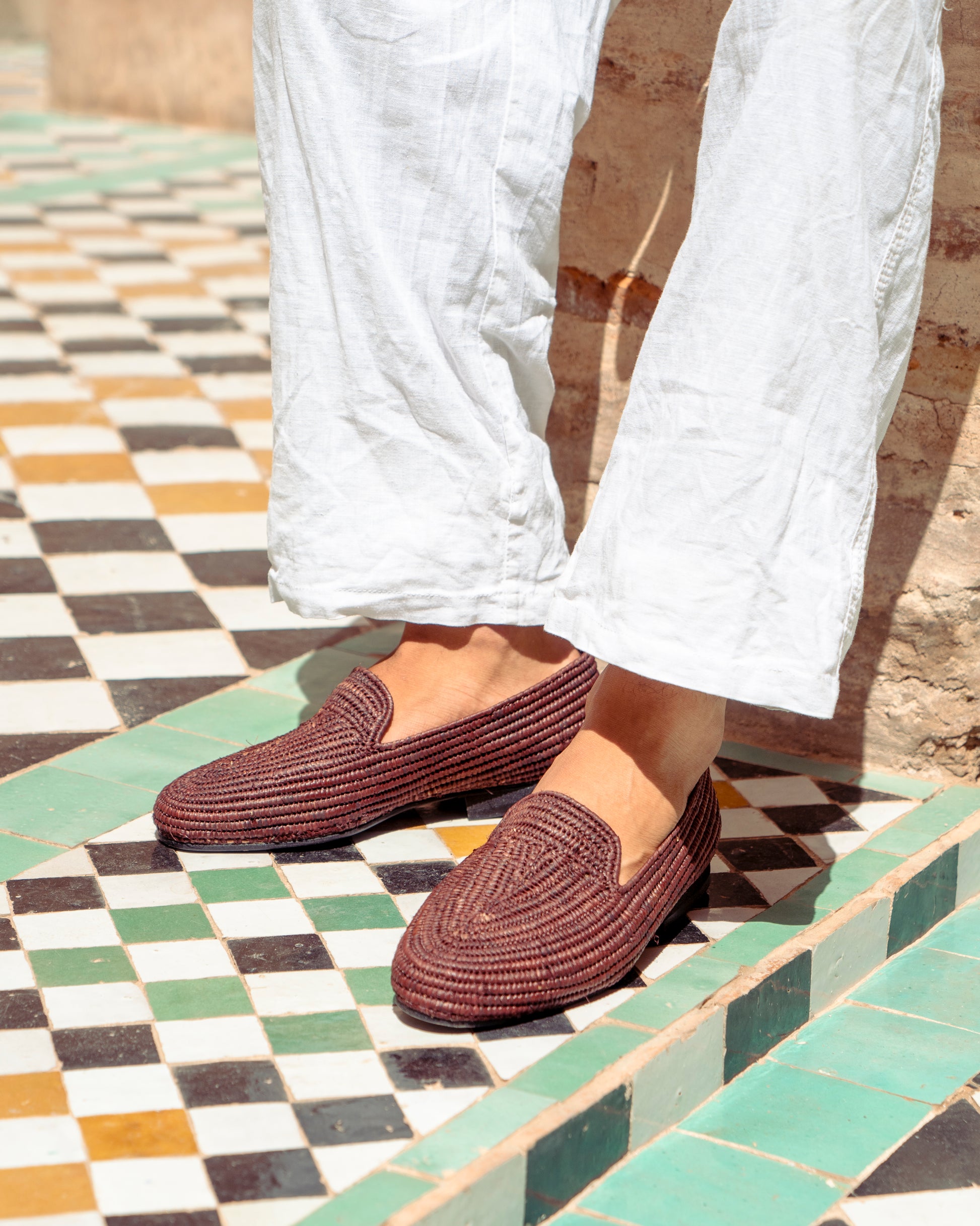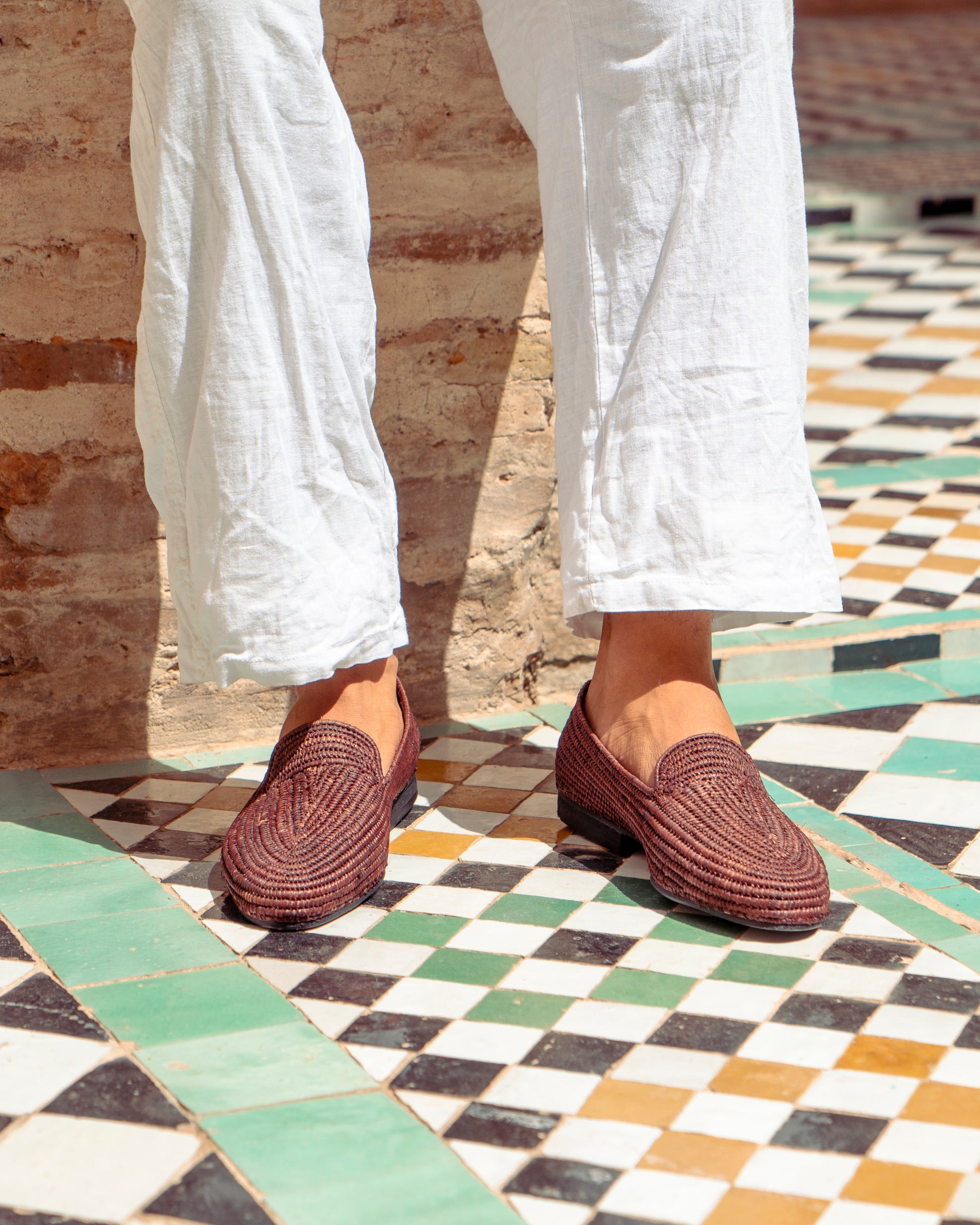 Classic shape, earthy texture. These brown raffia loafers are handwoven by artisans in Marrakech using natural raffia fibers dyed in a rich, grounded brown. Lightweight and breathable, they offer easy comfort with a warm tone that pairs effortlessly with linen, denim, or relaxed tailoring.
