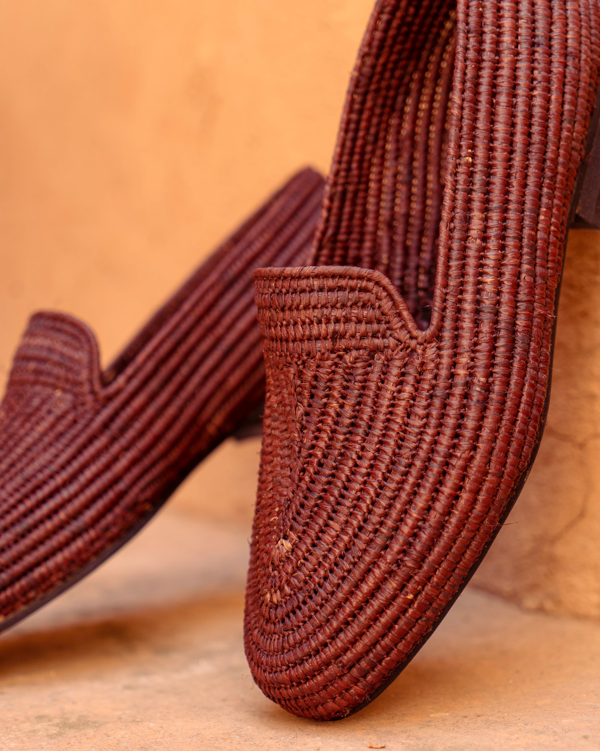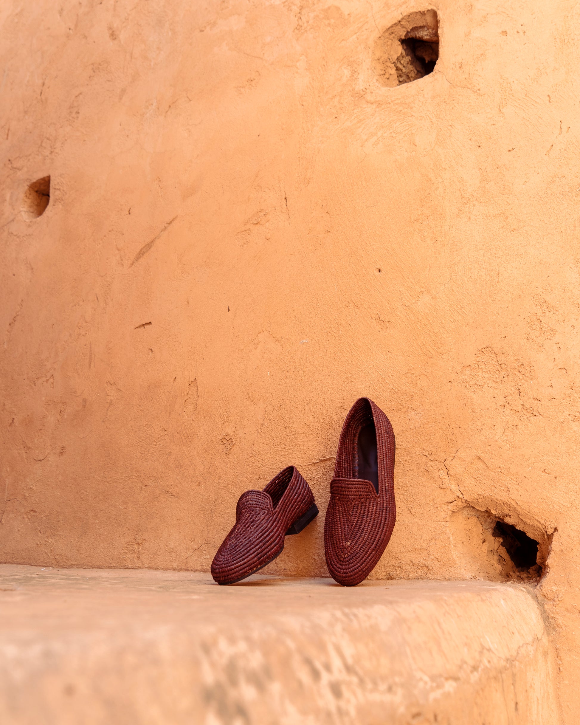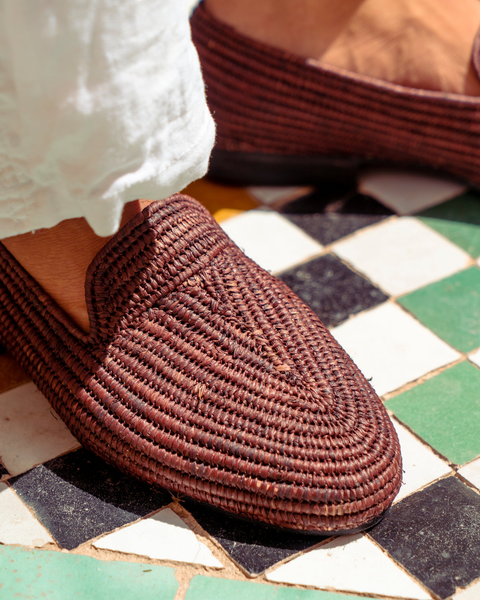 Classic shape, earthy texture. These brown raffia loafers are handwoven by artisans in Marrakech using natural raffia fibers dyed in a rich, grounded brown. Lightweight and breathable, they offer easy comfort with a warm tone that pairs effortlessly with linen, denim, or relaxed tailoring.