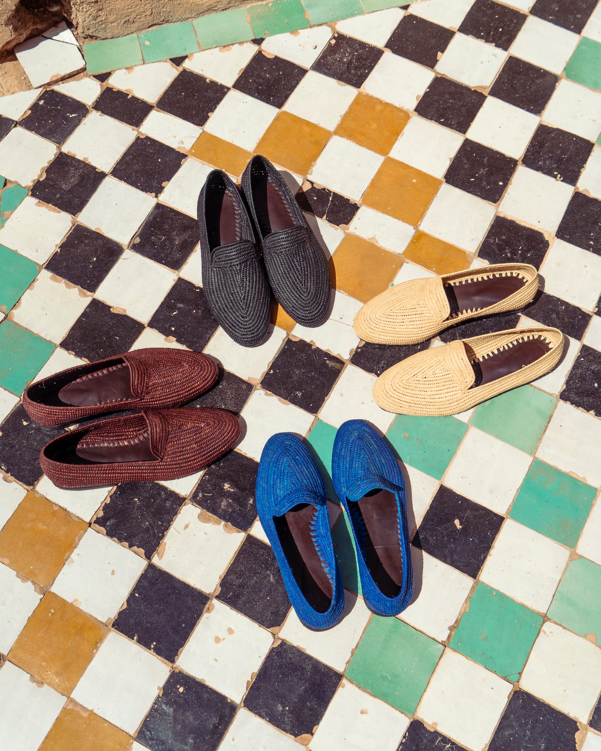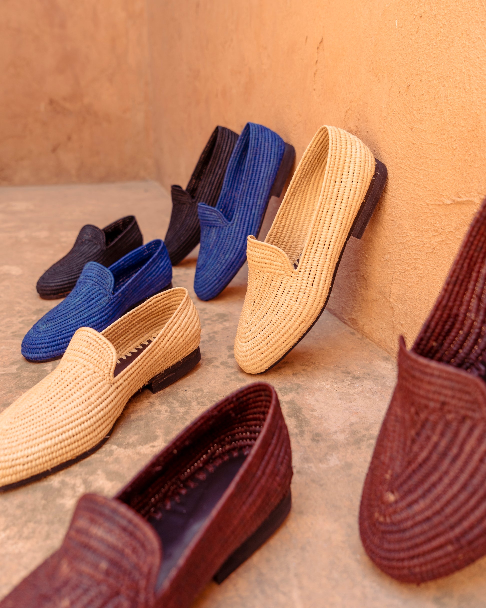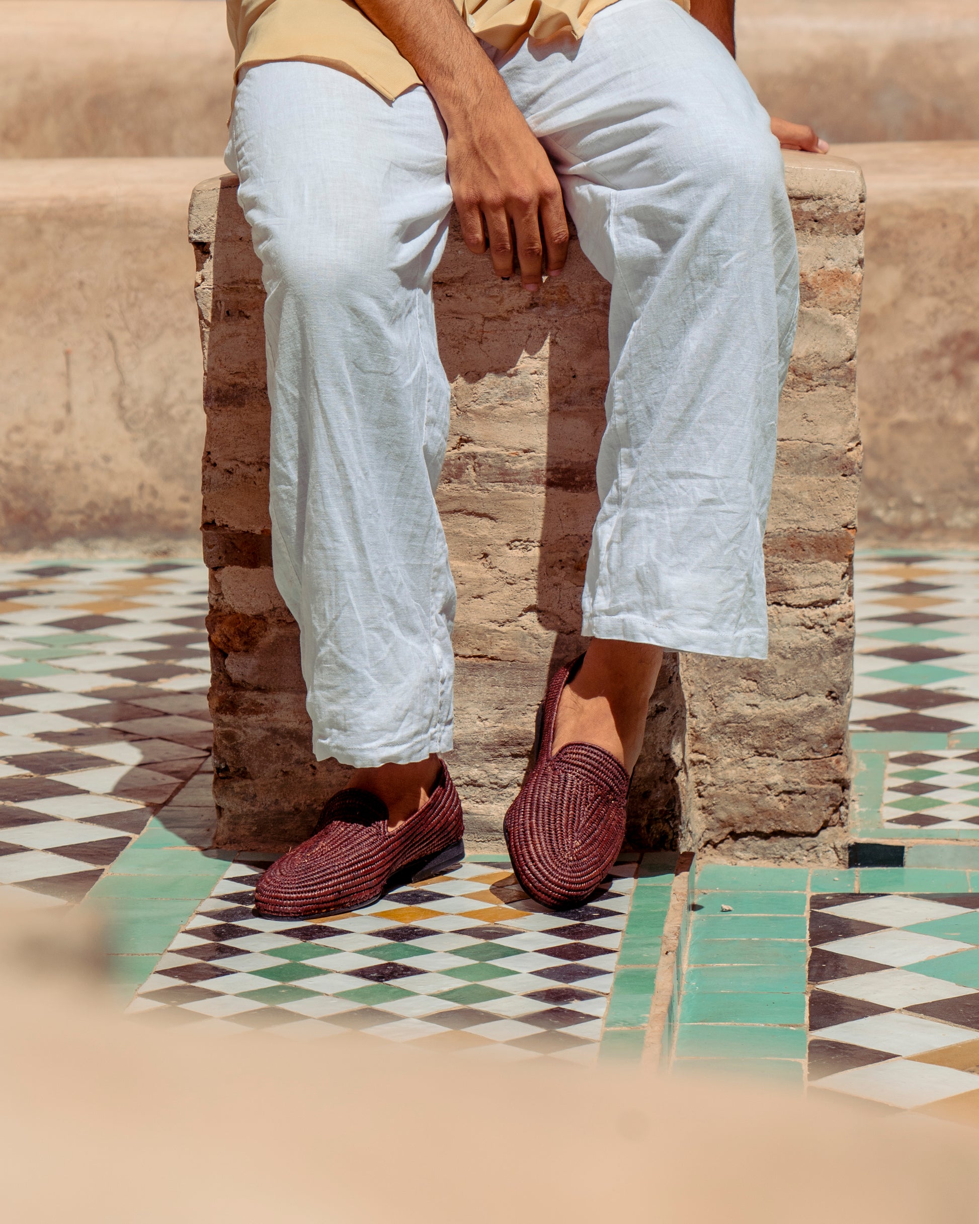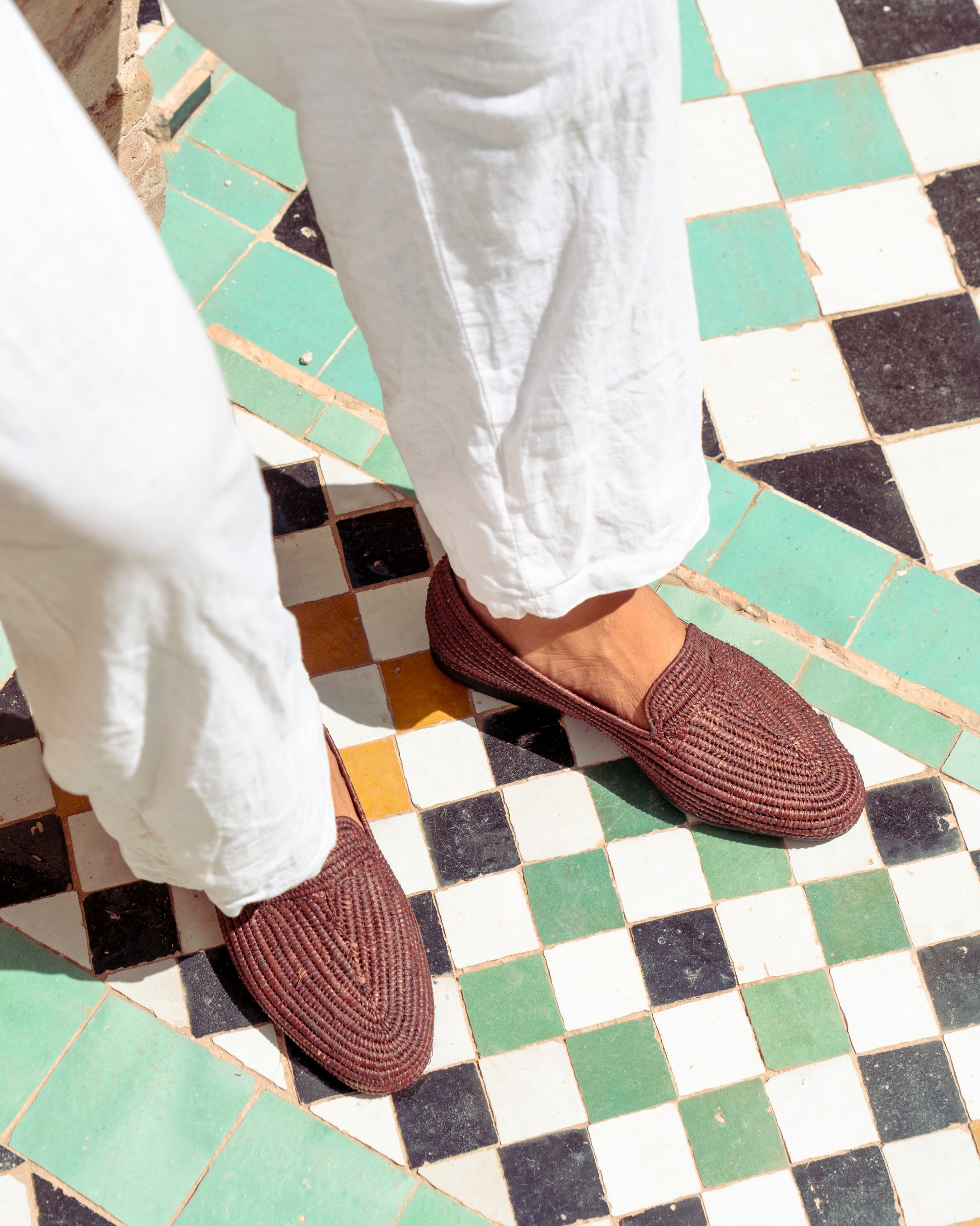 Classic shape, earthy texture. These brown raffia loafers are handwoven by artisans in Marrakech using natural raffia fibers dyed in a rich, grounded brown. Lightweight and breathable, they offer easy comfort with a warm tone that pairs effortlessly with linen, denim, or relaxed tailoring.