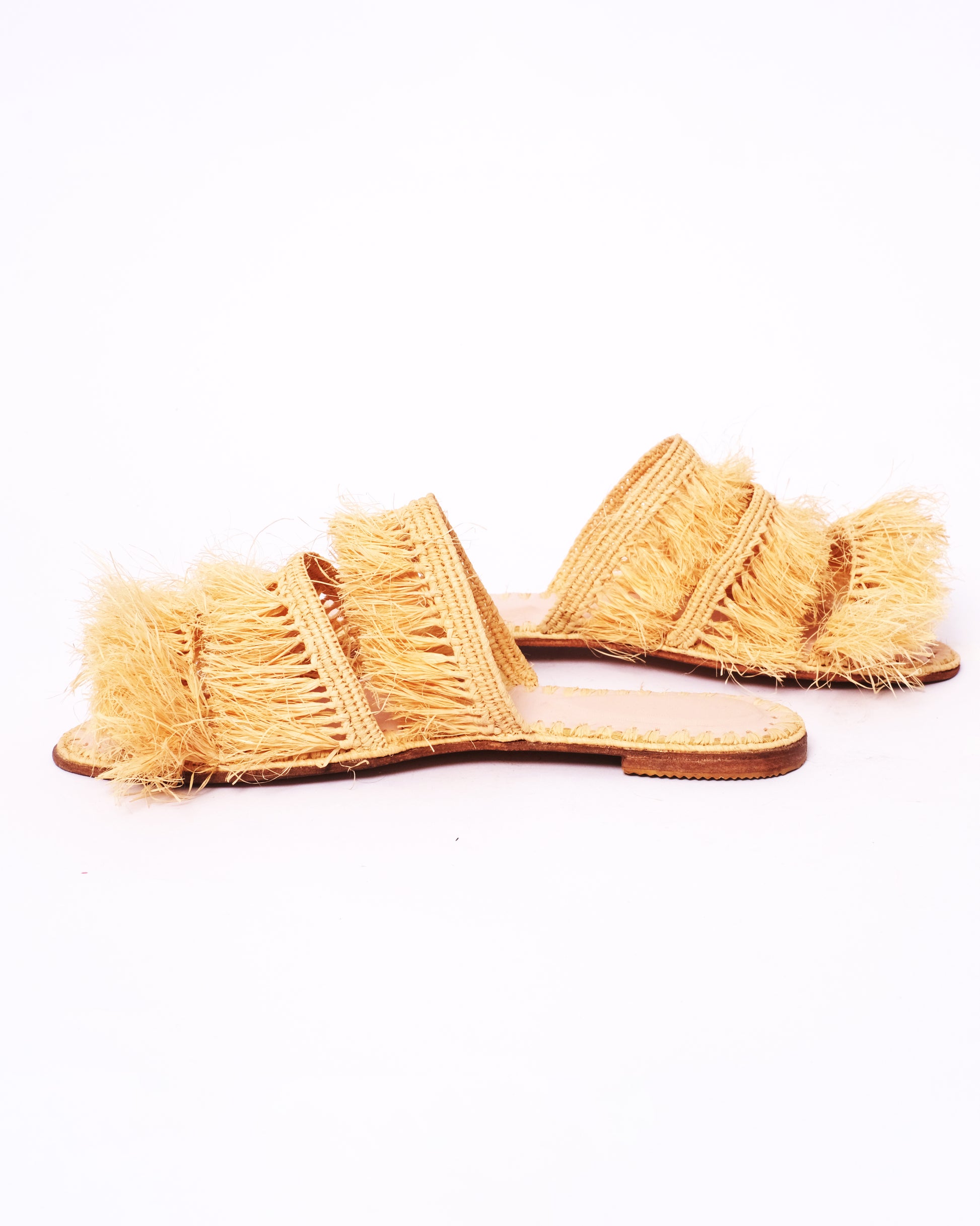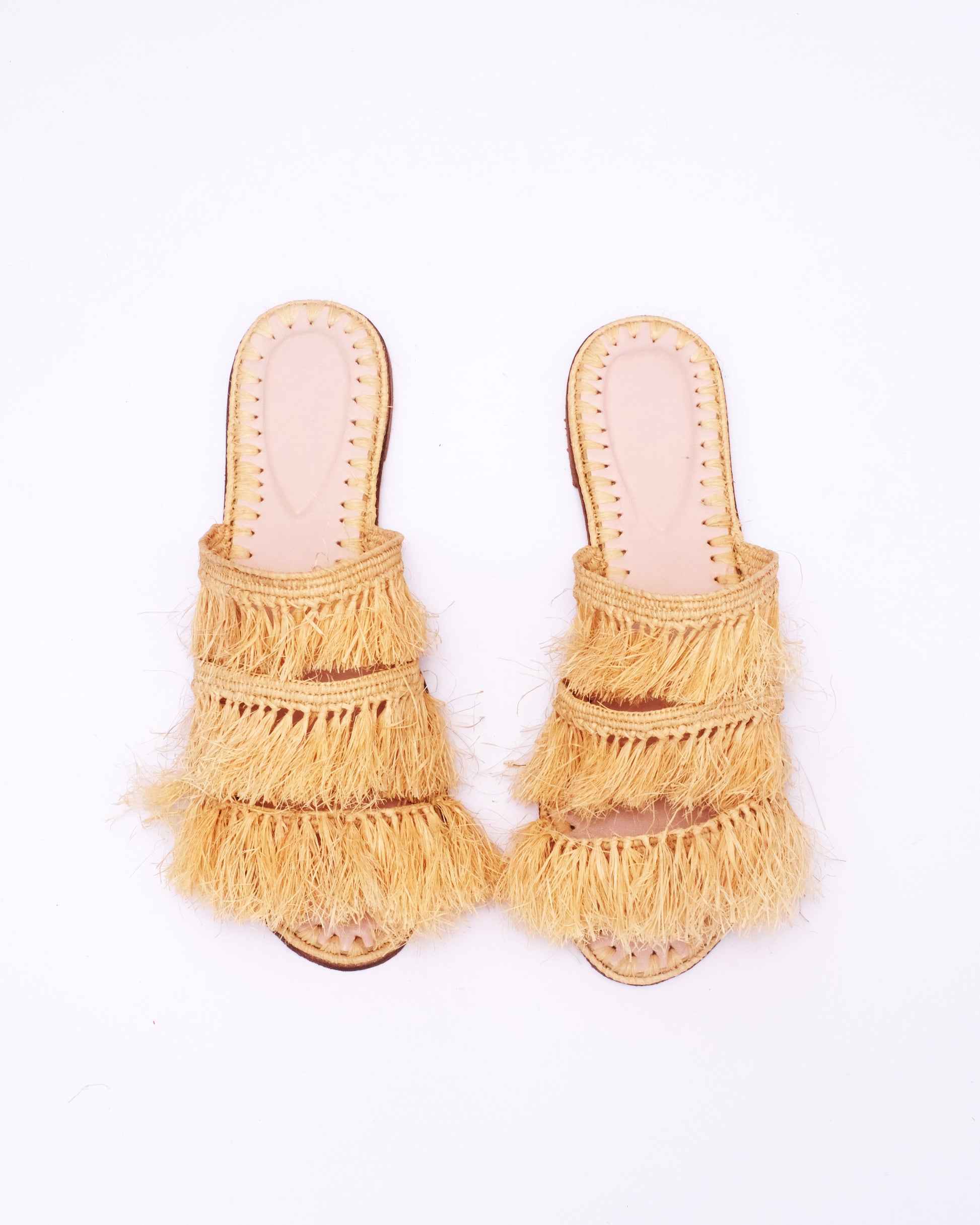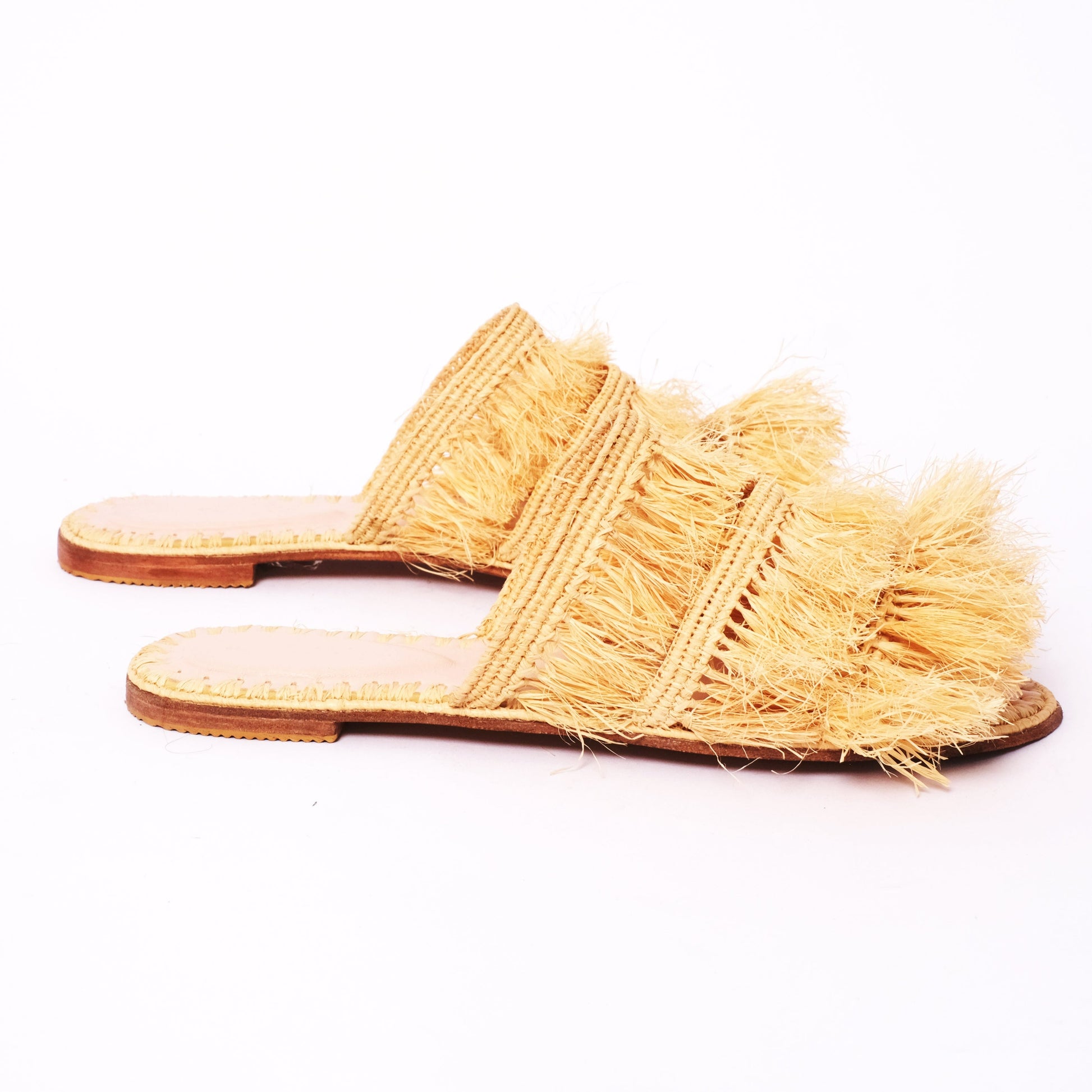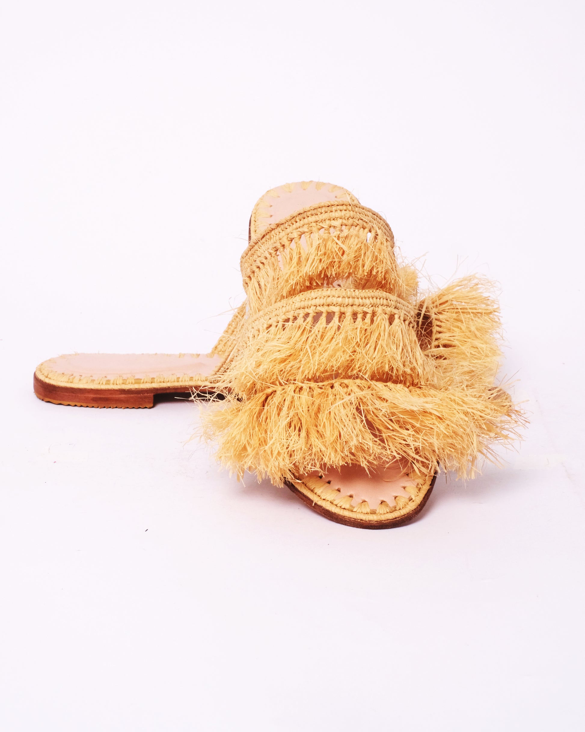 Double Strap Raffia Fringe Slides – Handmade in Natural Fiber, Morocco