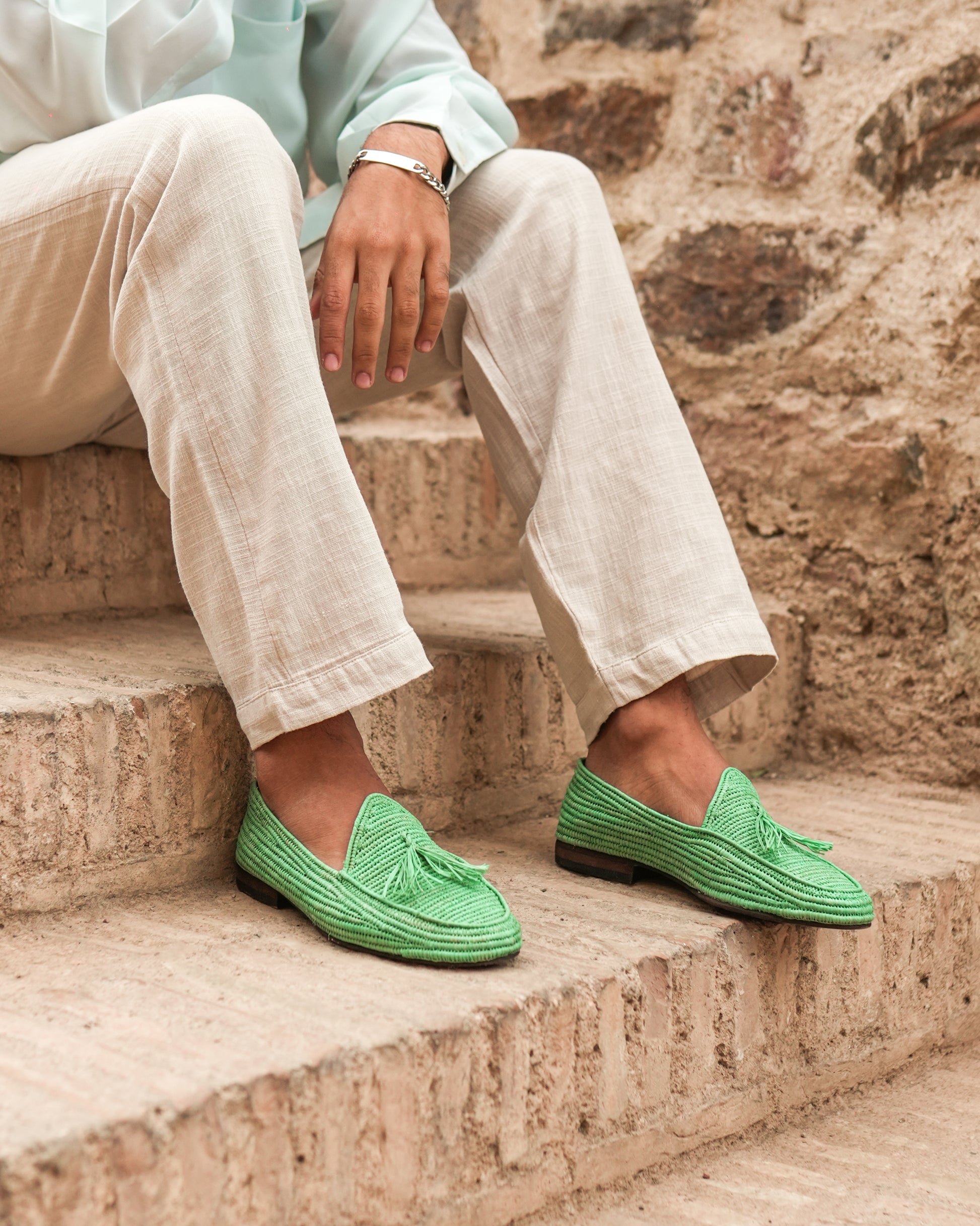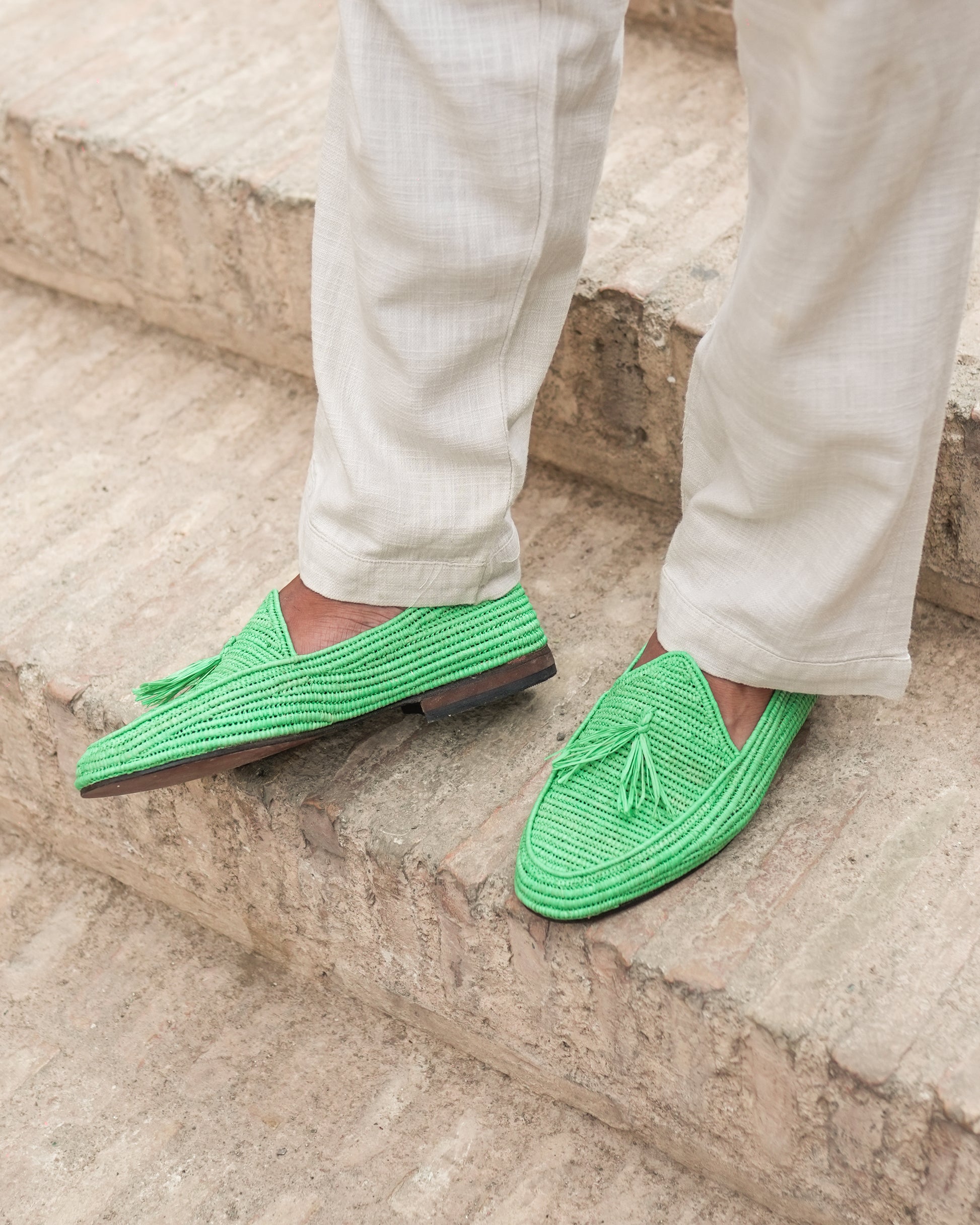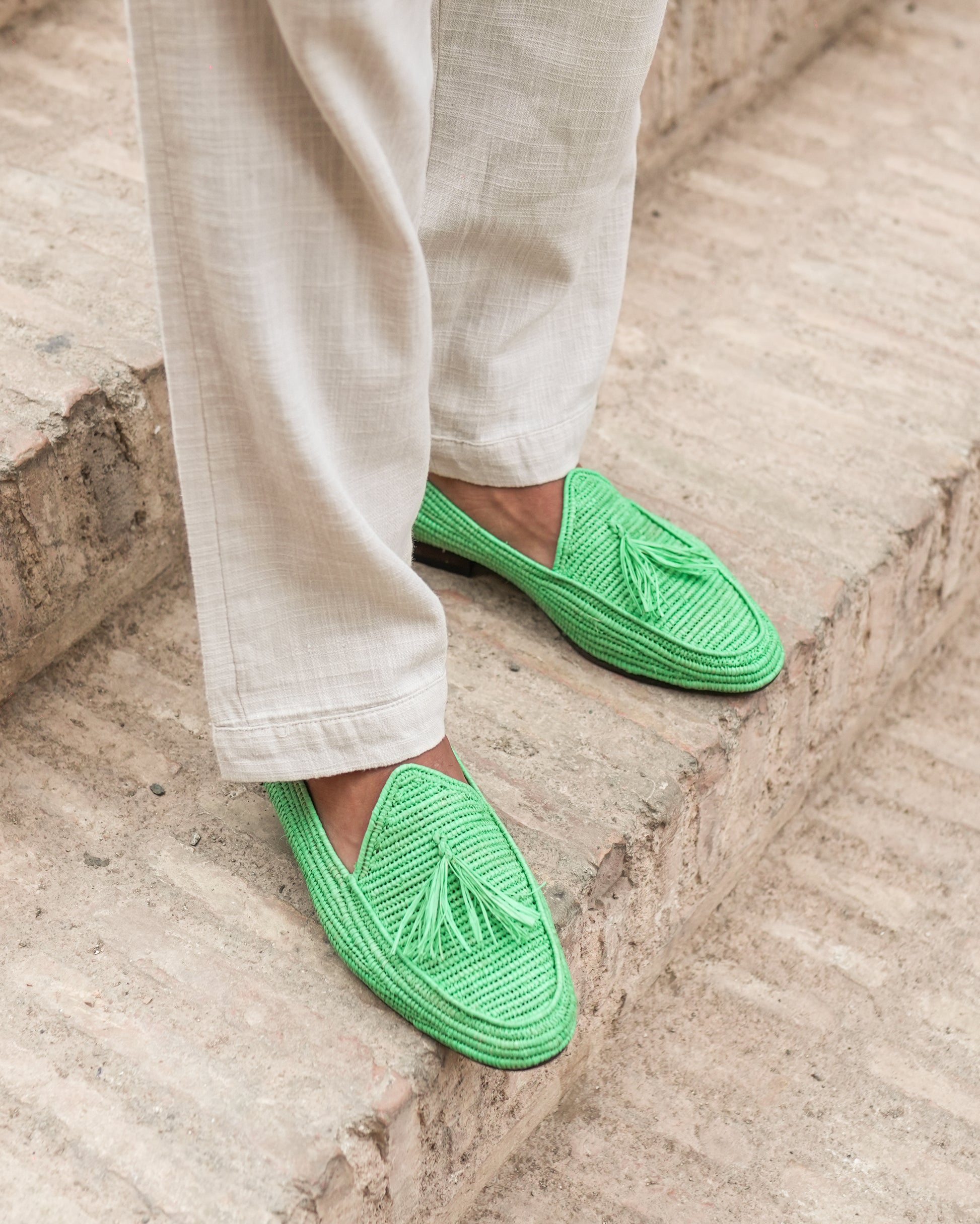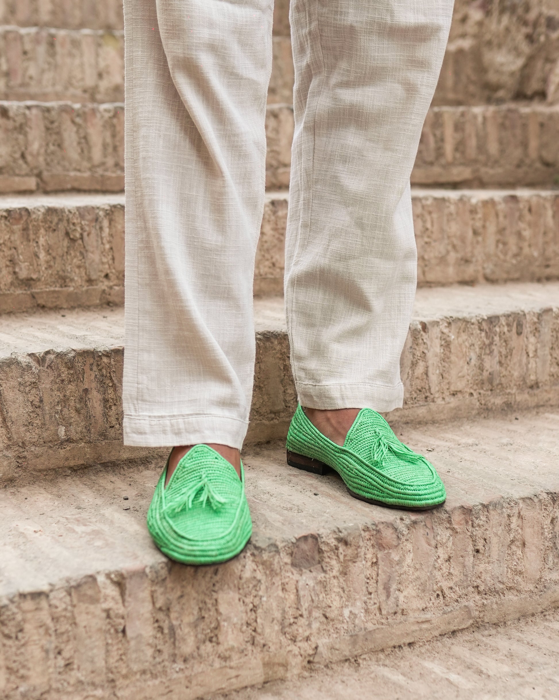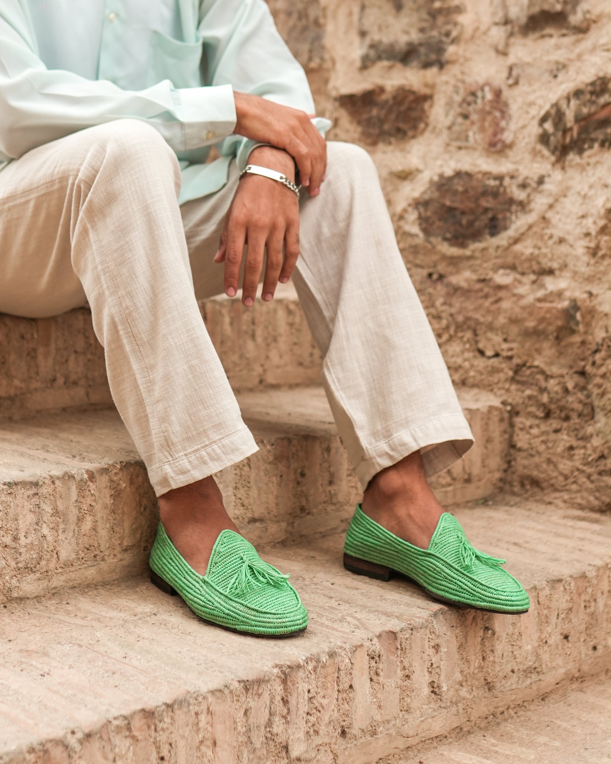 Men’s Handwoven Raffia Tassel Loafers – Green