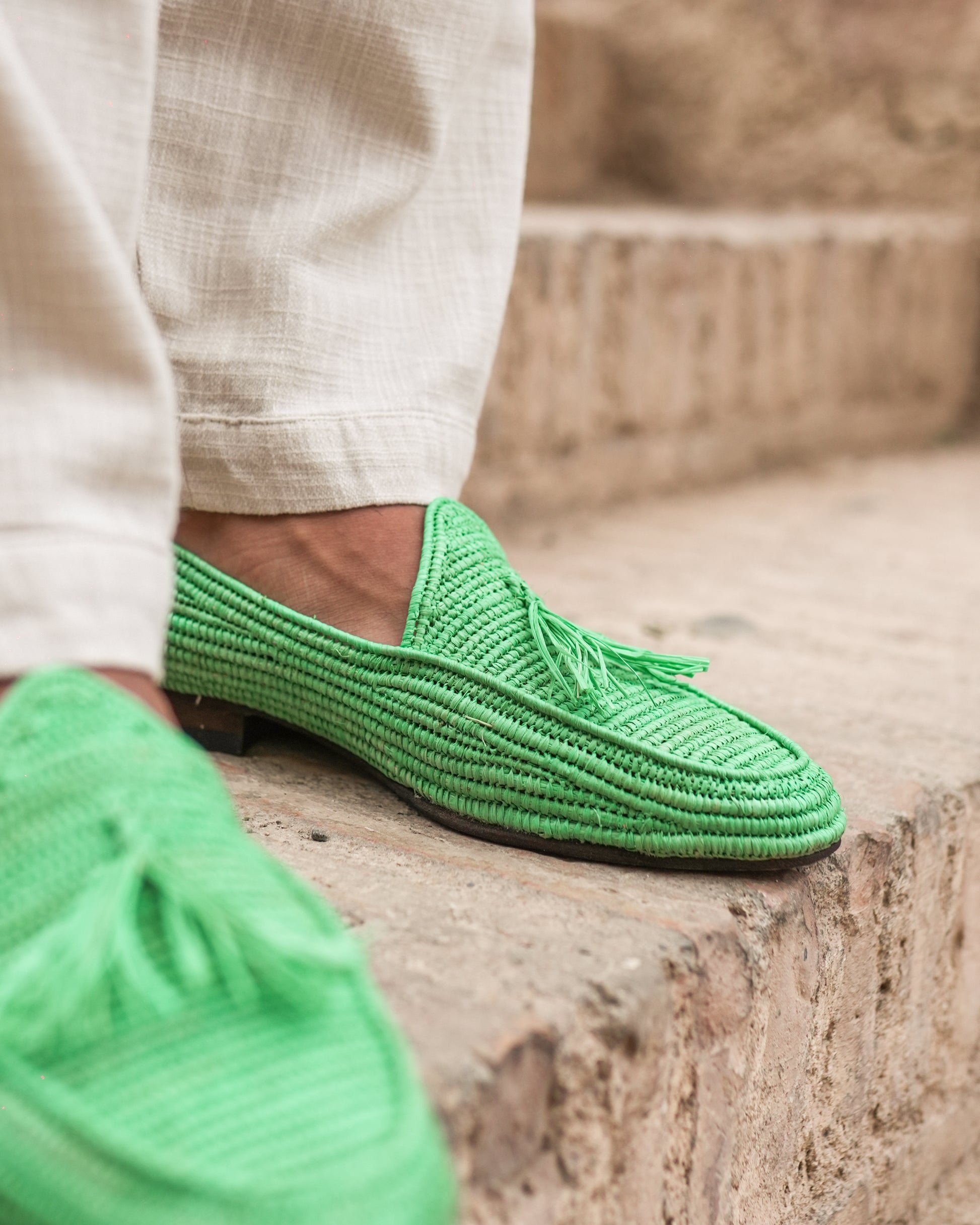 Green Raffia Loafers for Men – Handwoven Moroccan Slip-On Dress Shoes