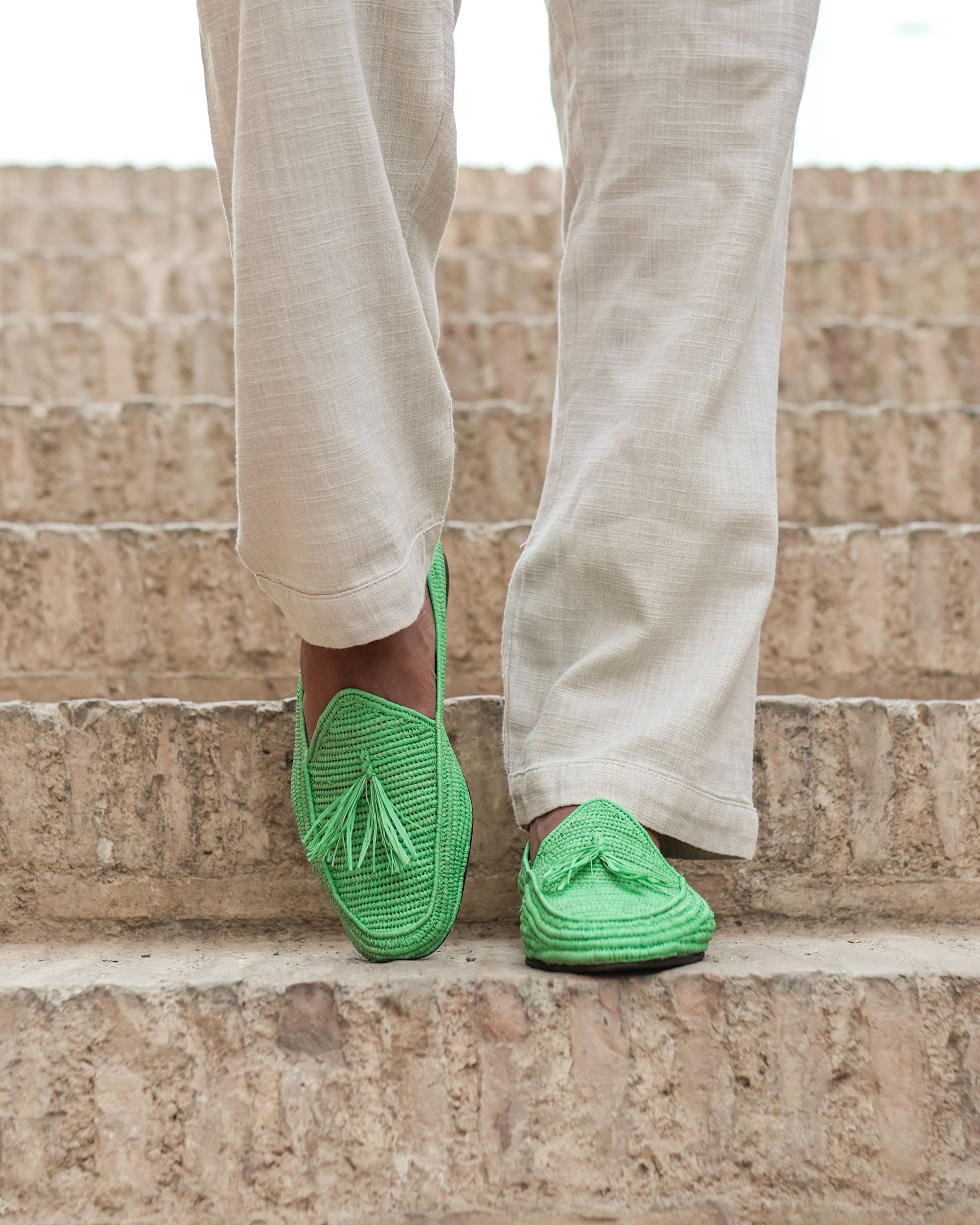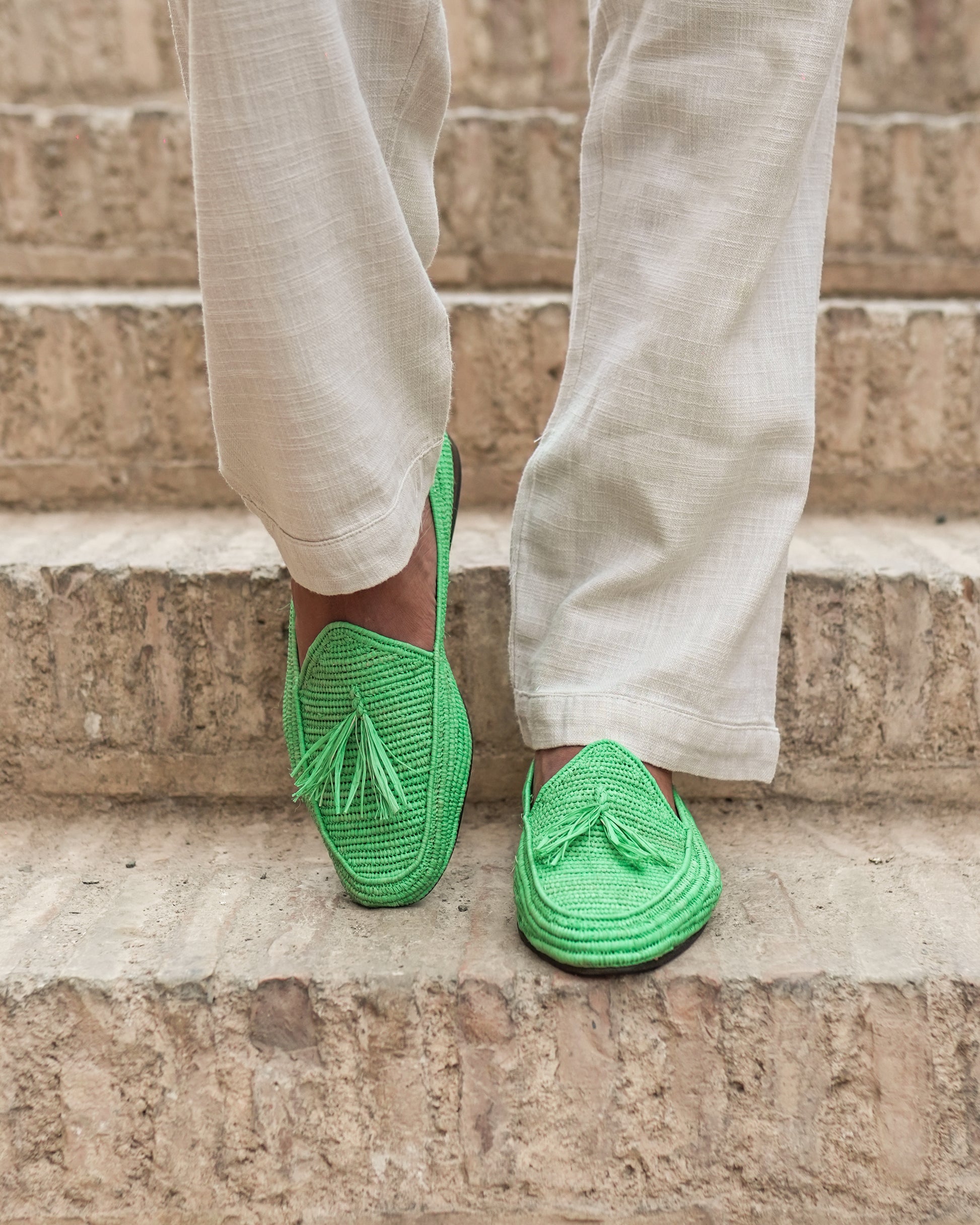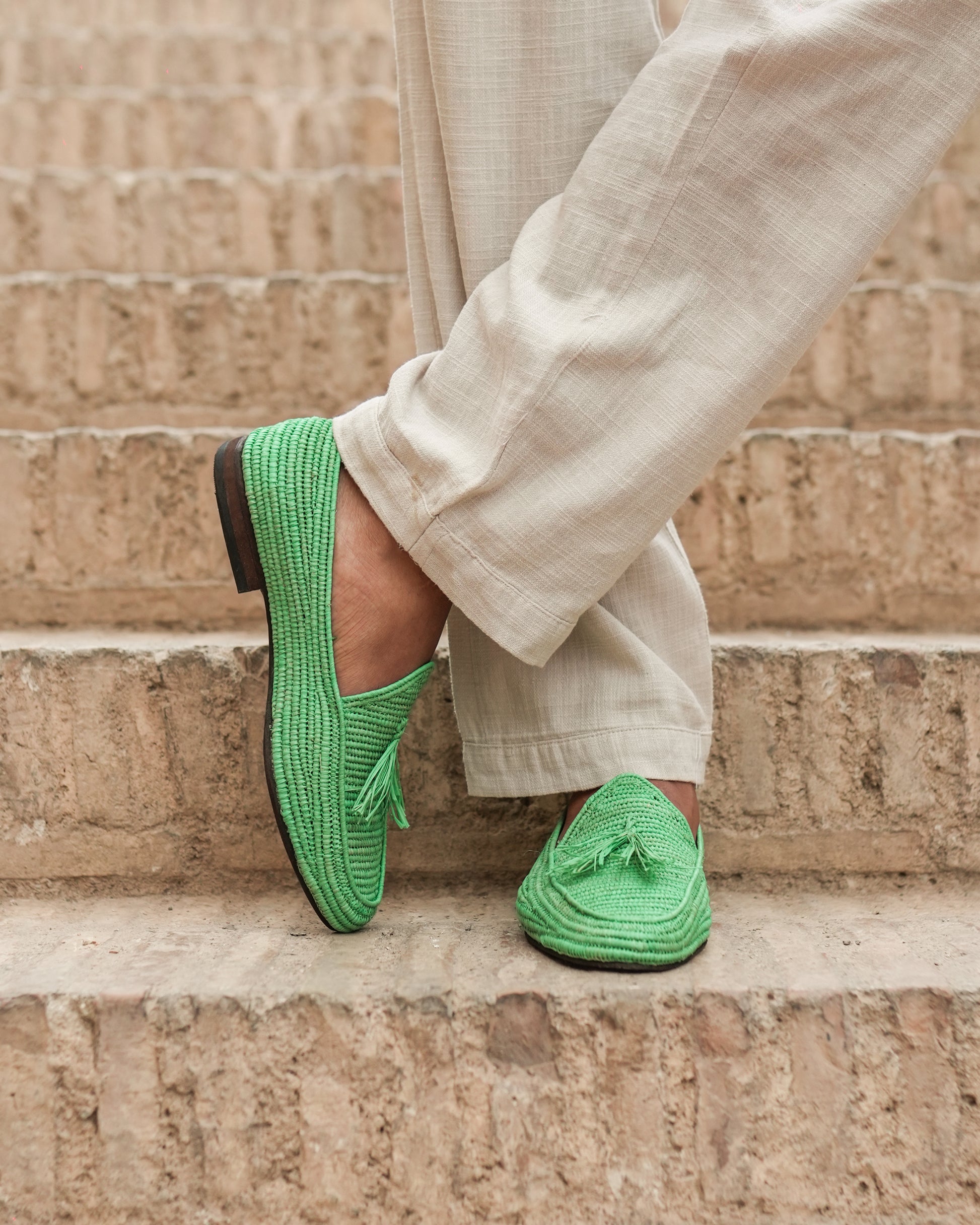 Artisan-made with a bold twist. These green raffia tassel loafers are handwoven in Marrakech using natural fibers and traditional Moroccan craftsmanship. The clean silhouette is accented with raffia tassels for a refined yet playful touch.