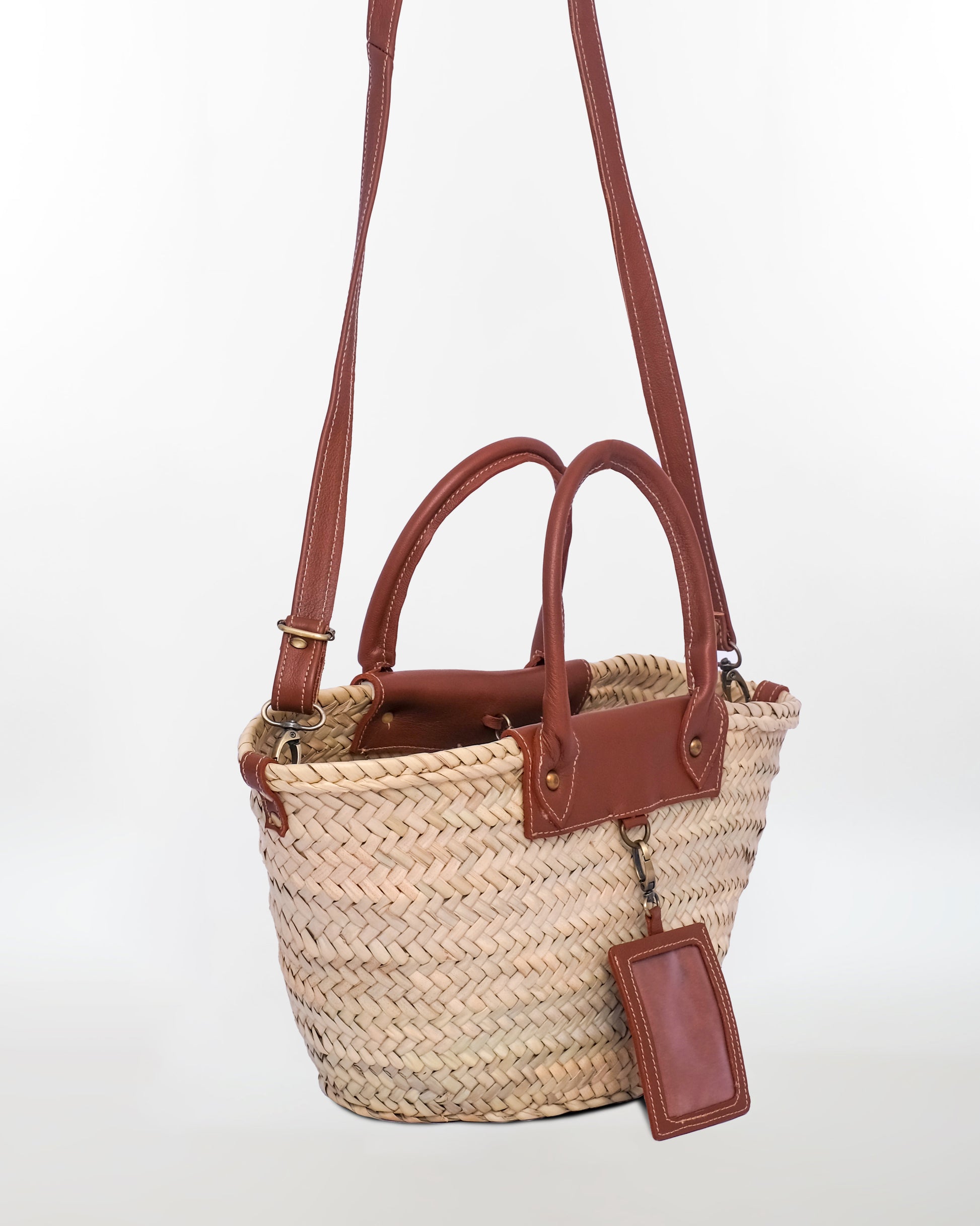 This mini Moroccan tote blends handwoven straw with premium leather details. Designed for those who travel light, it features short rolled leather handles, a removable shoulder strap, and a leather ID tag for a refined finish. Perfect for everyday essentials — phone, keys, wallet, and go.