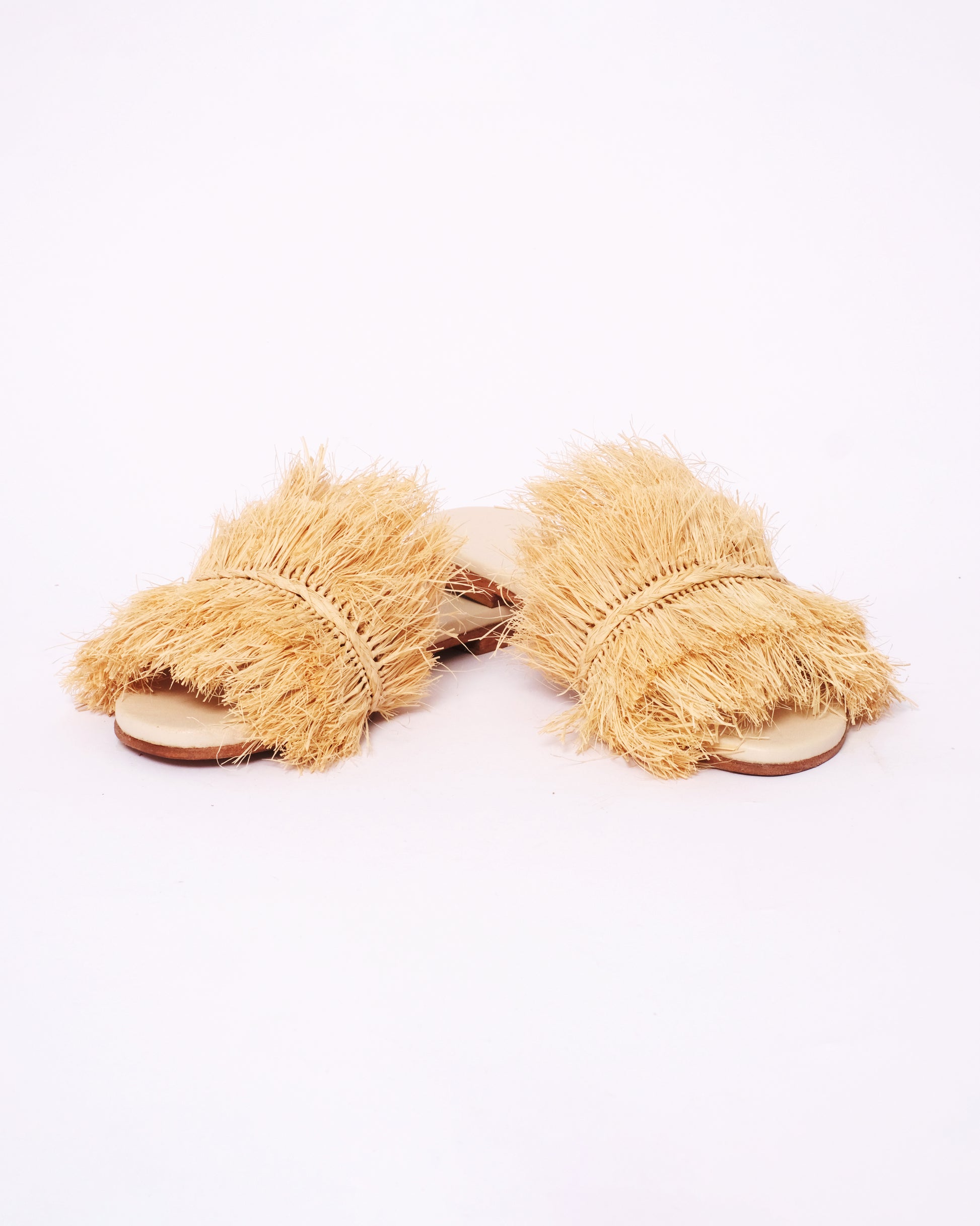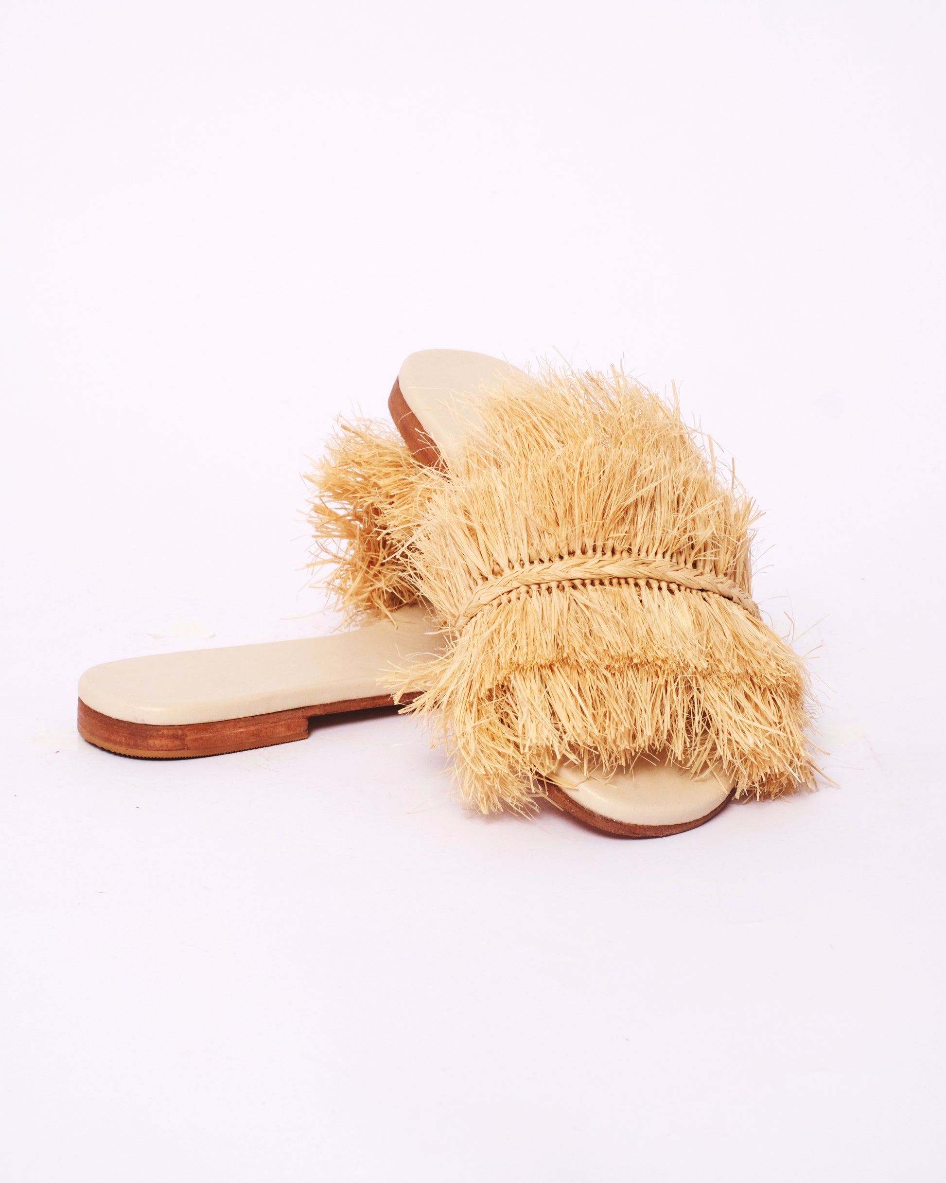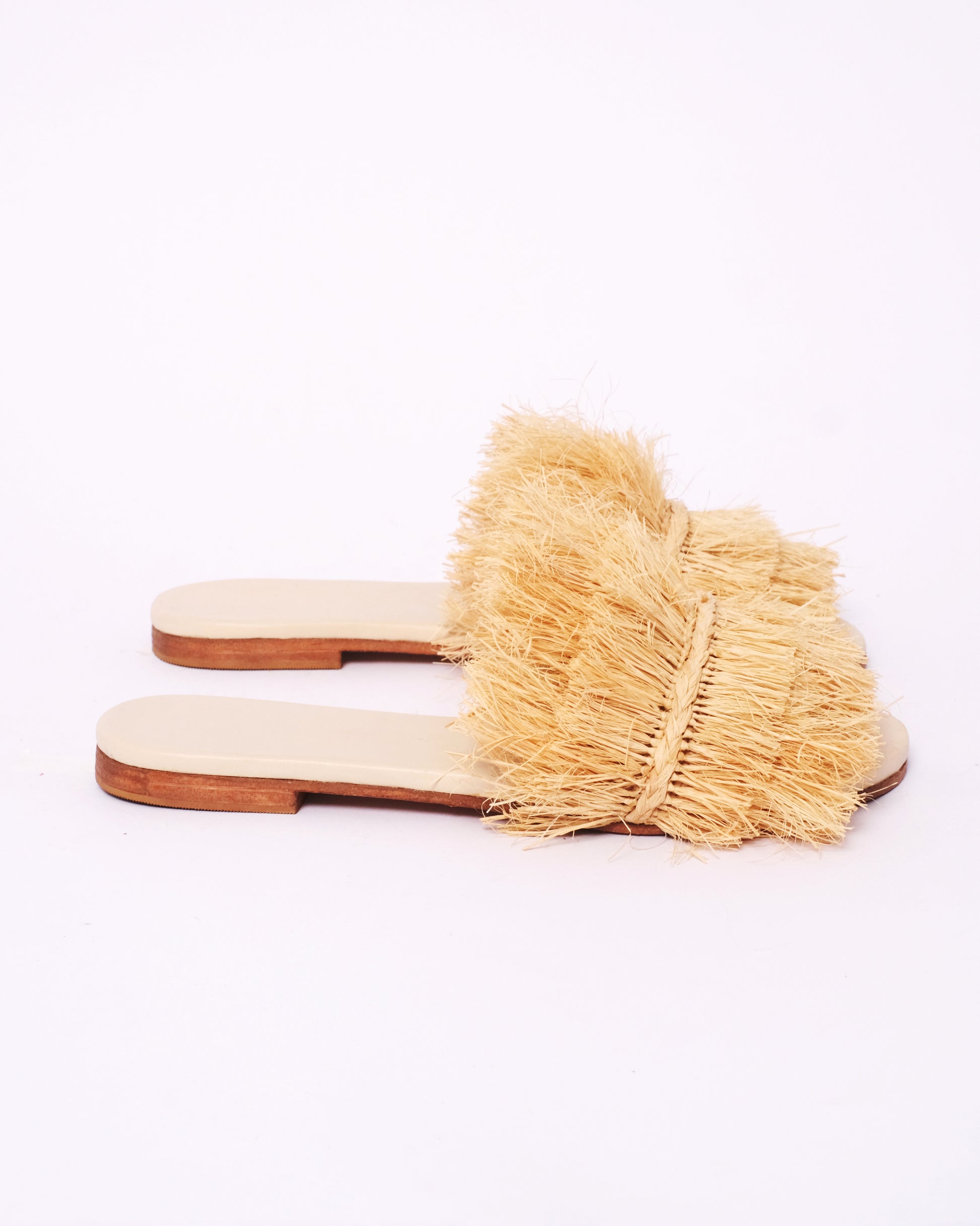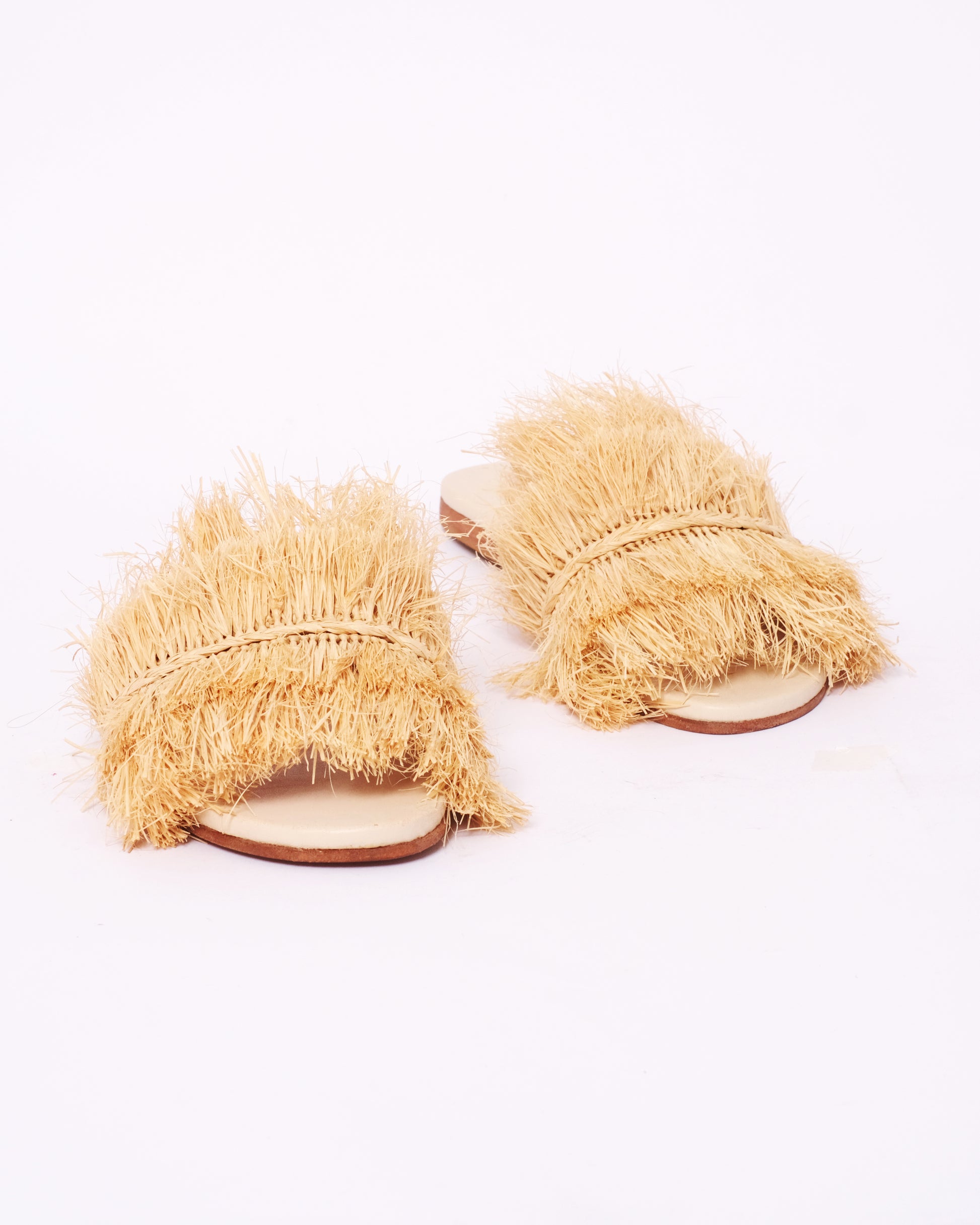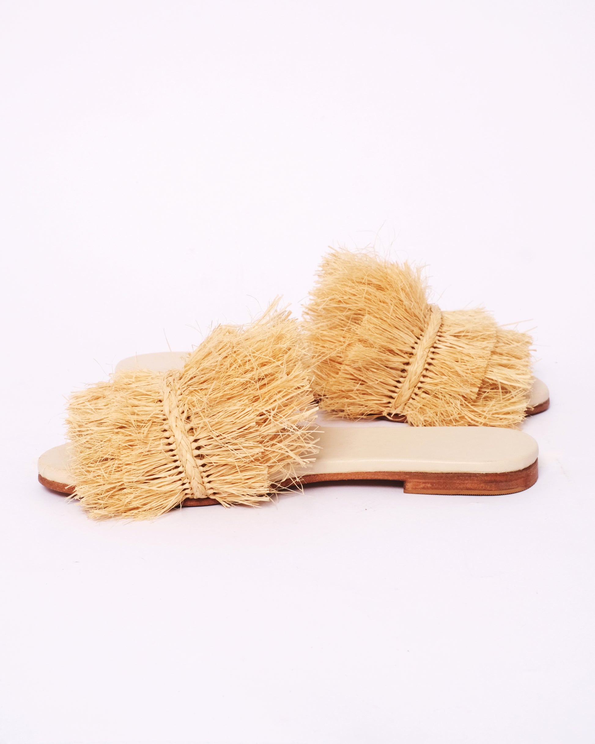 For those who love texture and bold design, these raffia fringe slides are a standout piece. Handwoven by Moroccan artisans, each pair features dramatic layers of raffia on a flat leather base, making them both artistic and wearable.