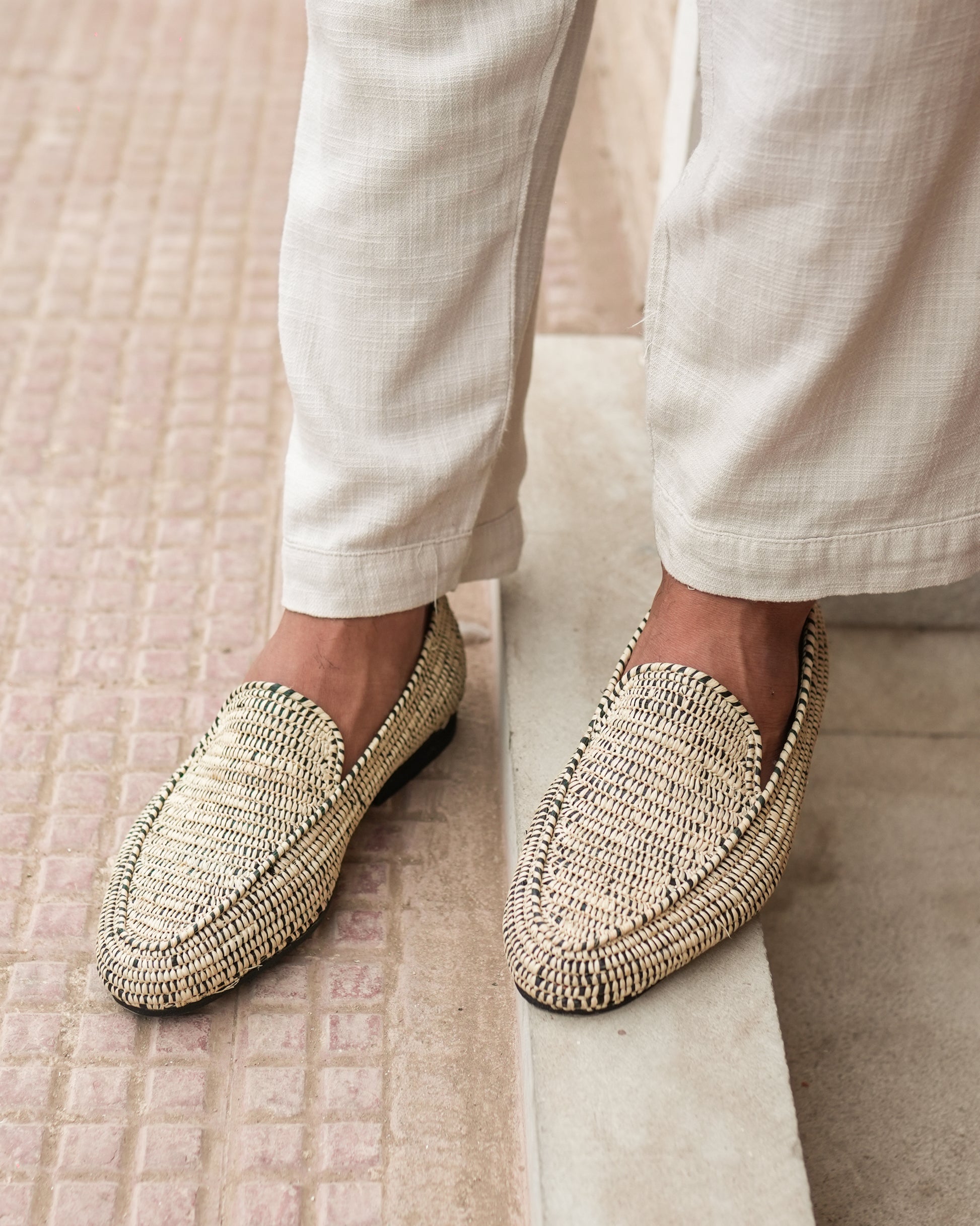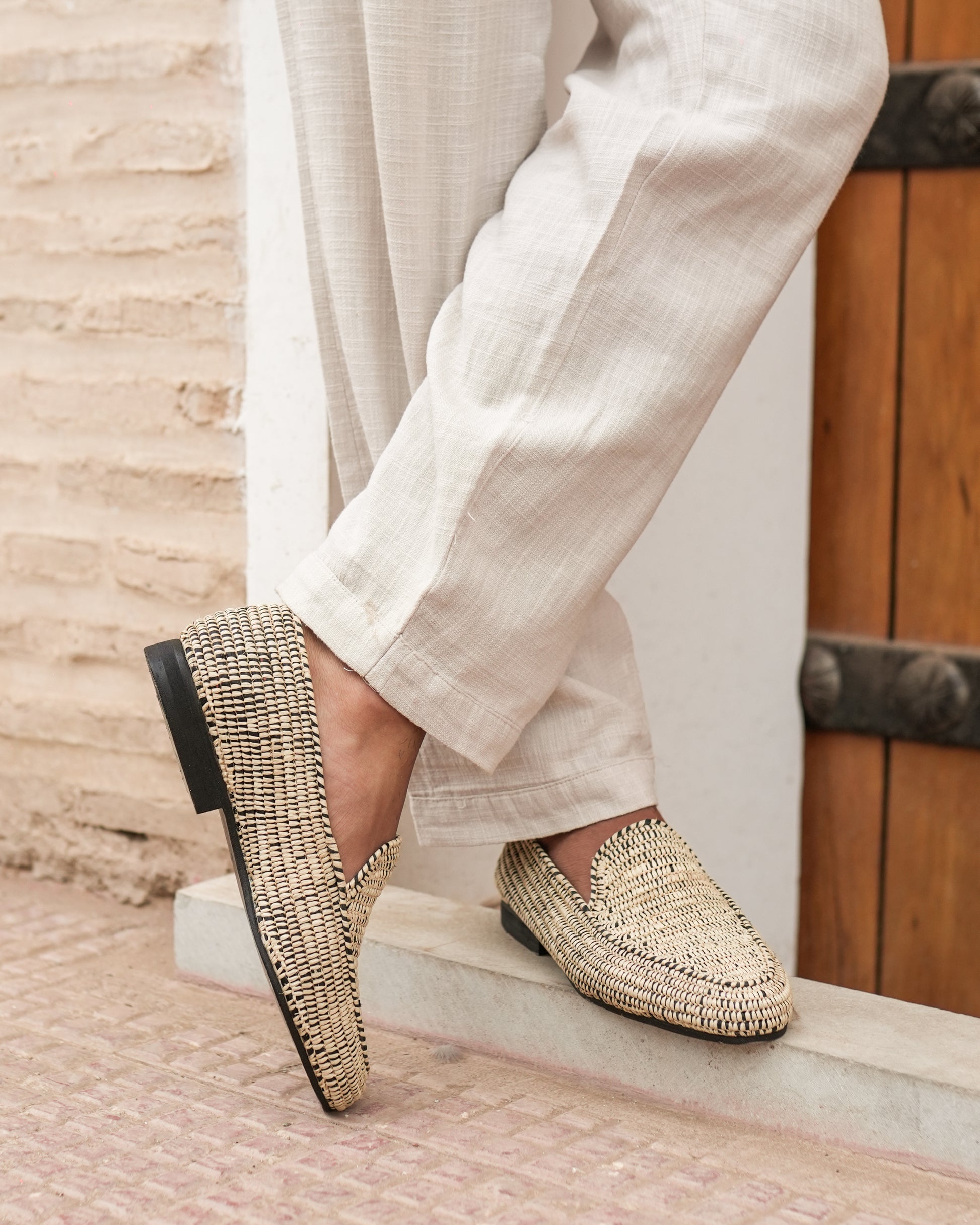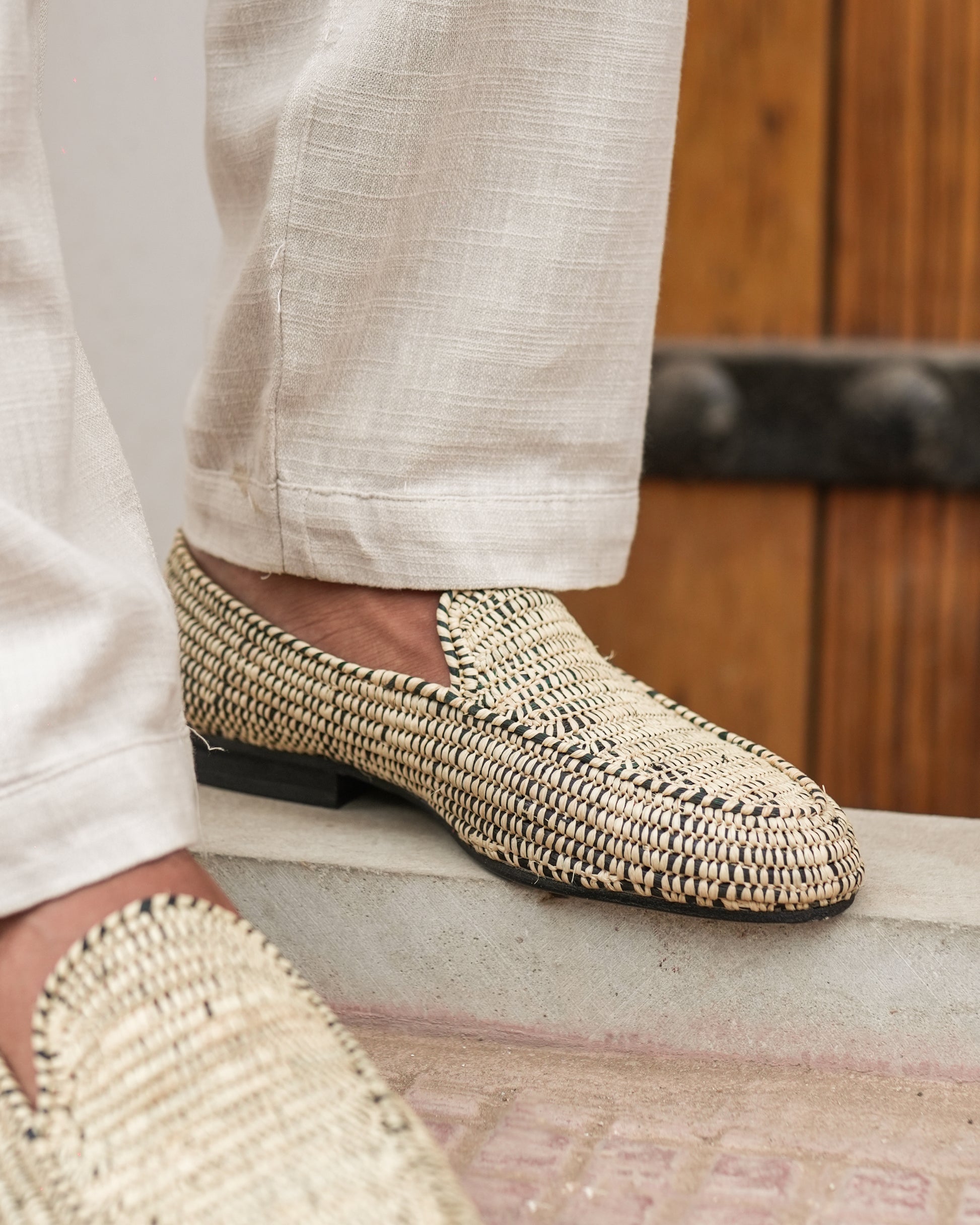 Lightweight, breathable, and designed to stand out. These raffia loafers feature a unique natural and black weave pattern, handwoven by artisans in Marrakech using traditional techniques and natural fibers.