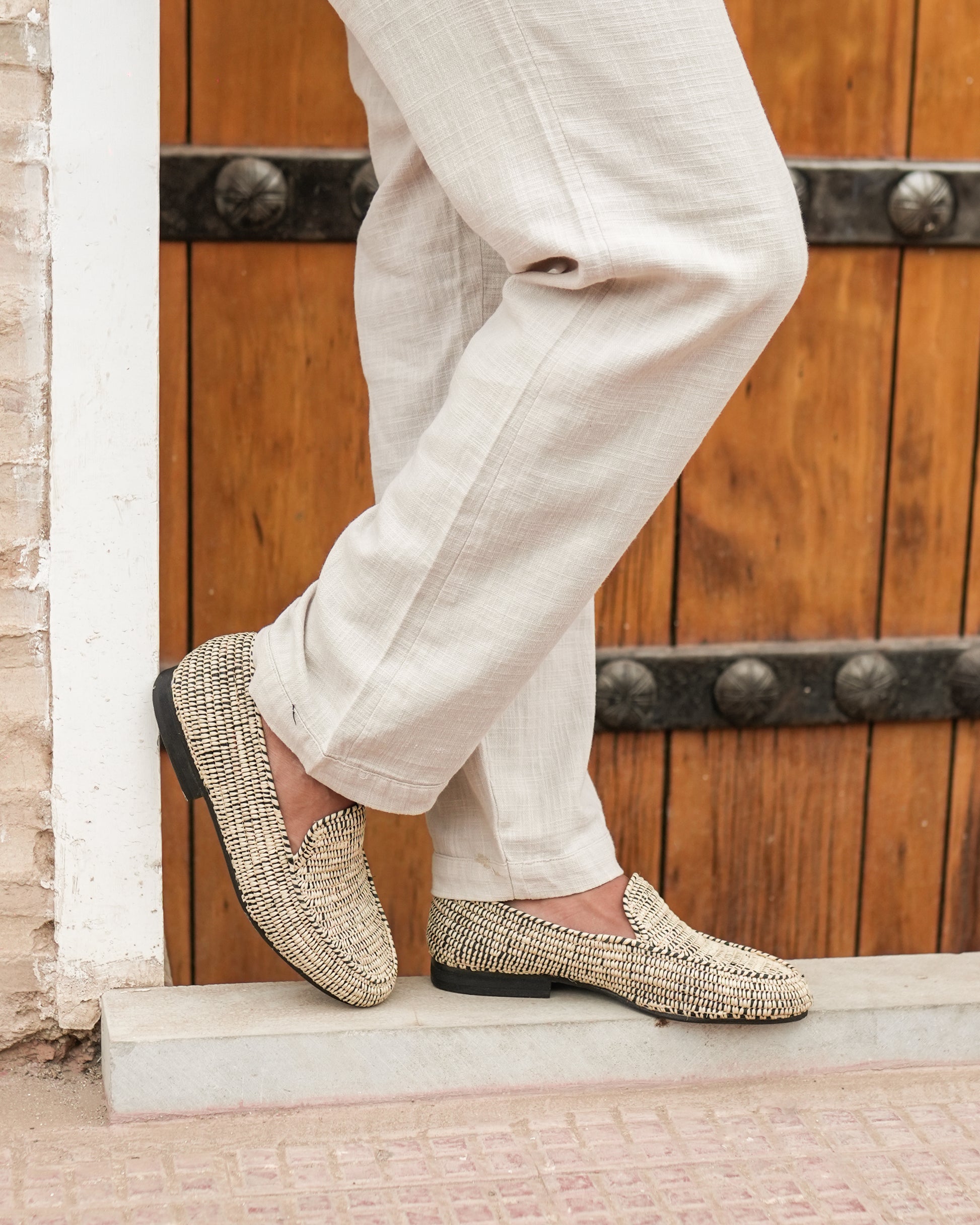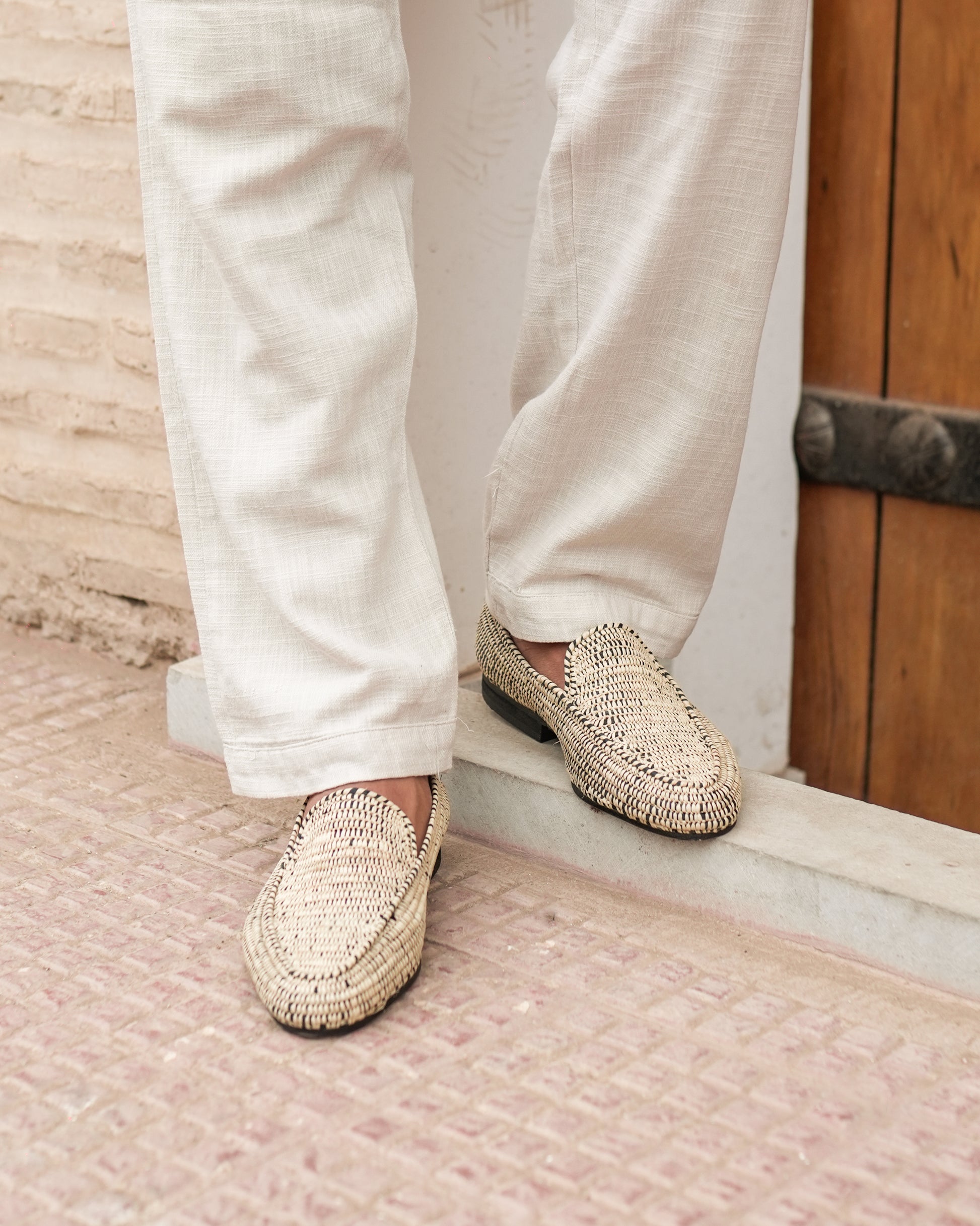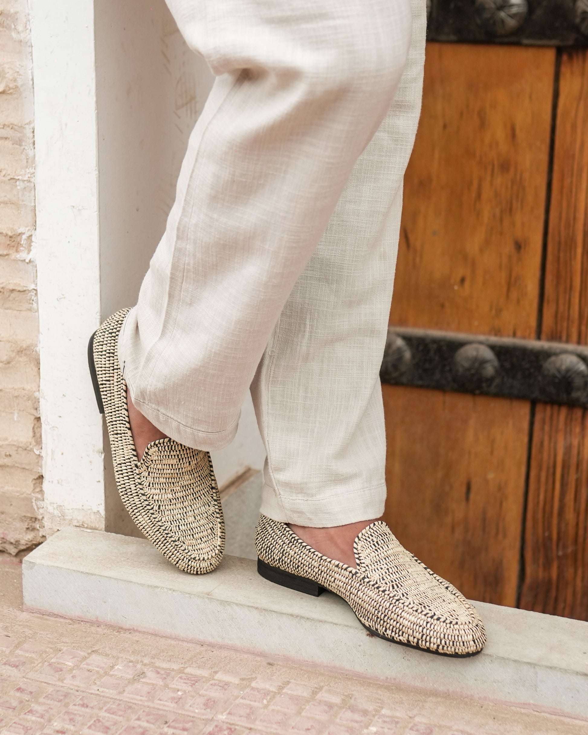 Lightweight, breathable, and designed to stand out. These raffia loafers feature a unique natural and black weave pattern, handwoven by artisans in Marrakech using traditional techniques and natural fibers.