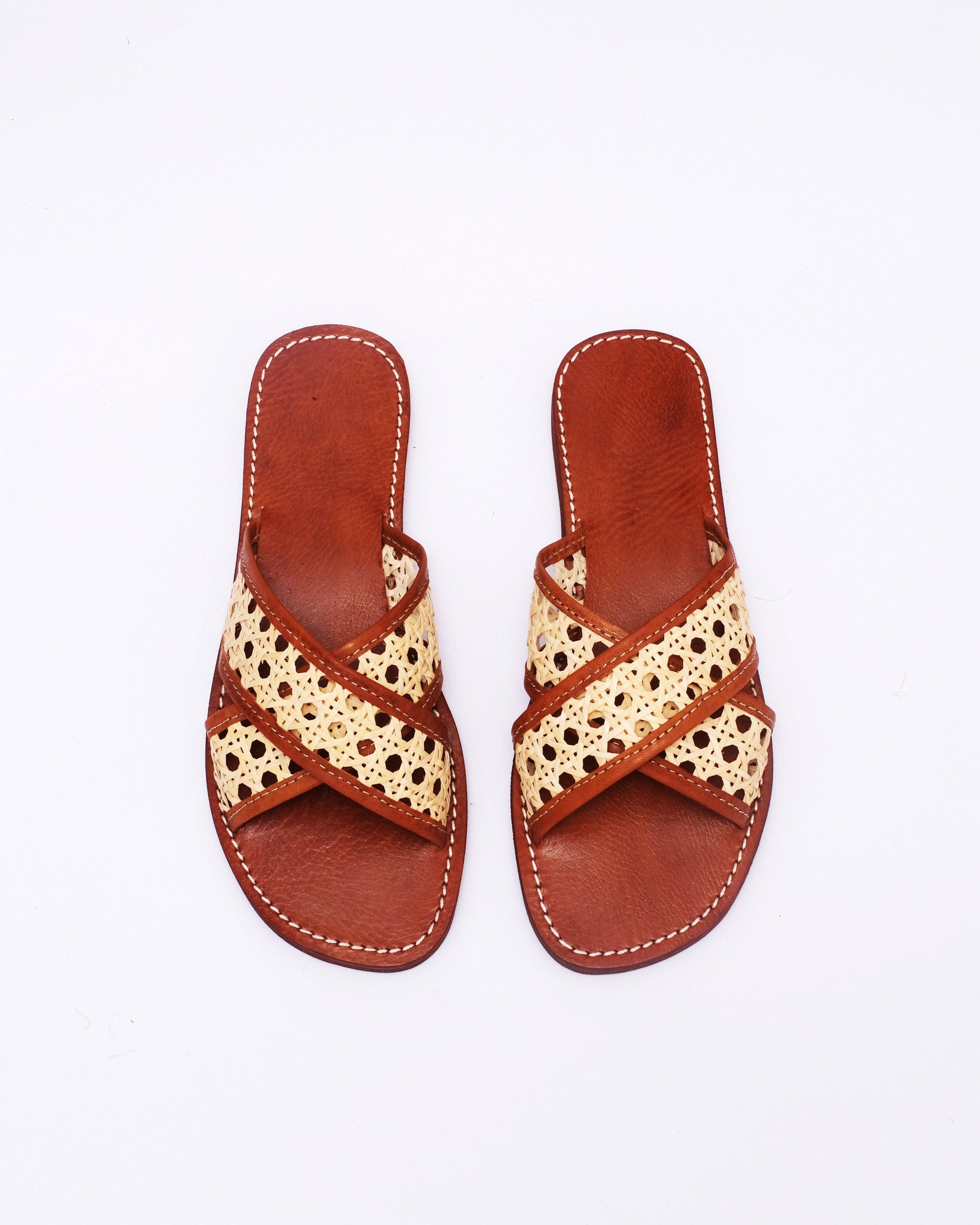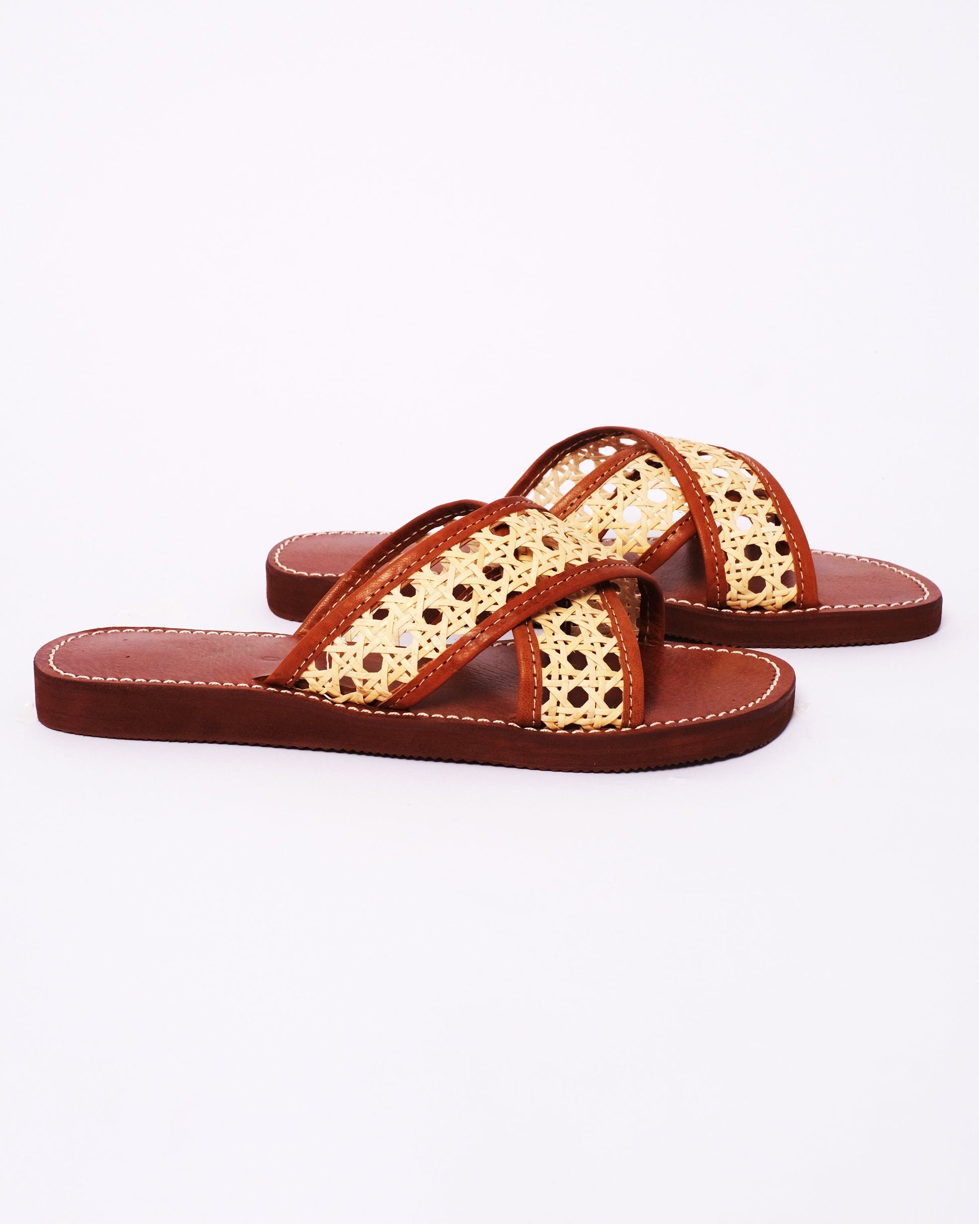 <p>Combining structure and lightness, these handmade leather and cane sandals are crafted by Moroccan artisans using traditional weaving and leatherwork. The natural cane criss-cross upper gives breathability, while the full leather sole brings lasting durability and comfort.</p>
