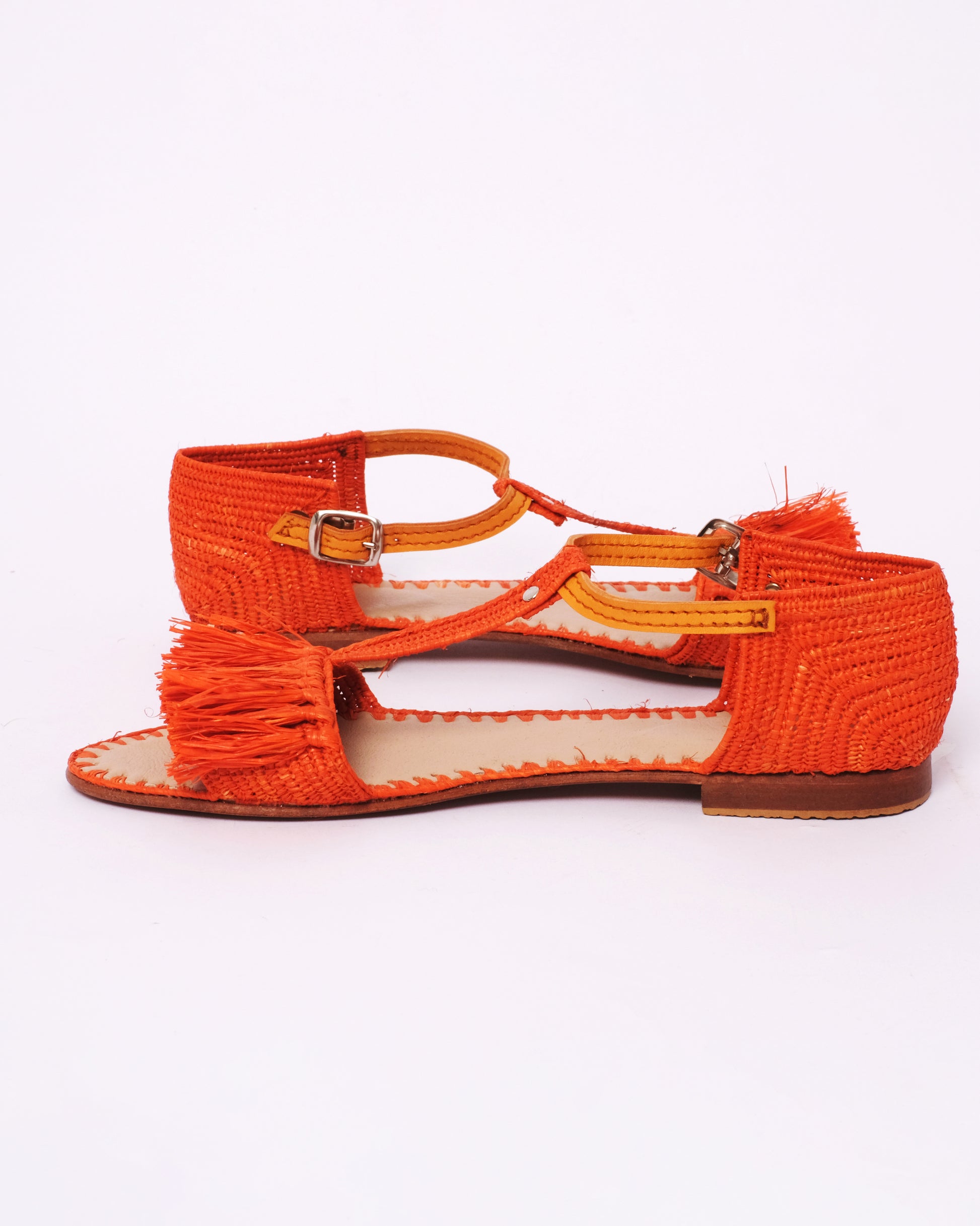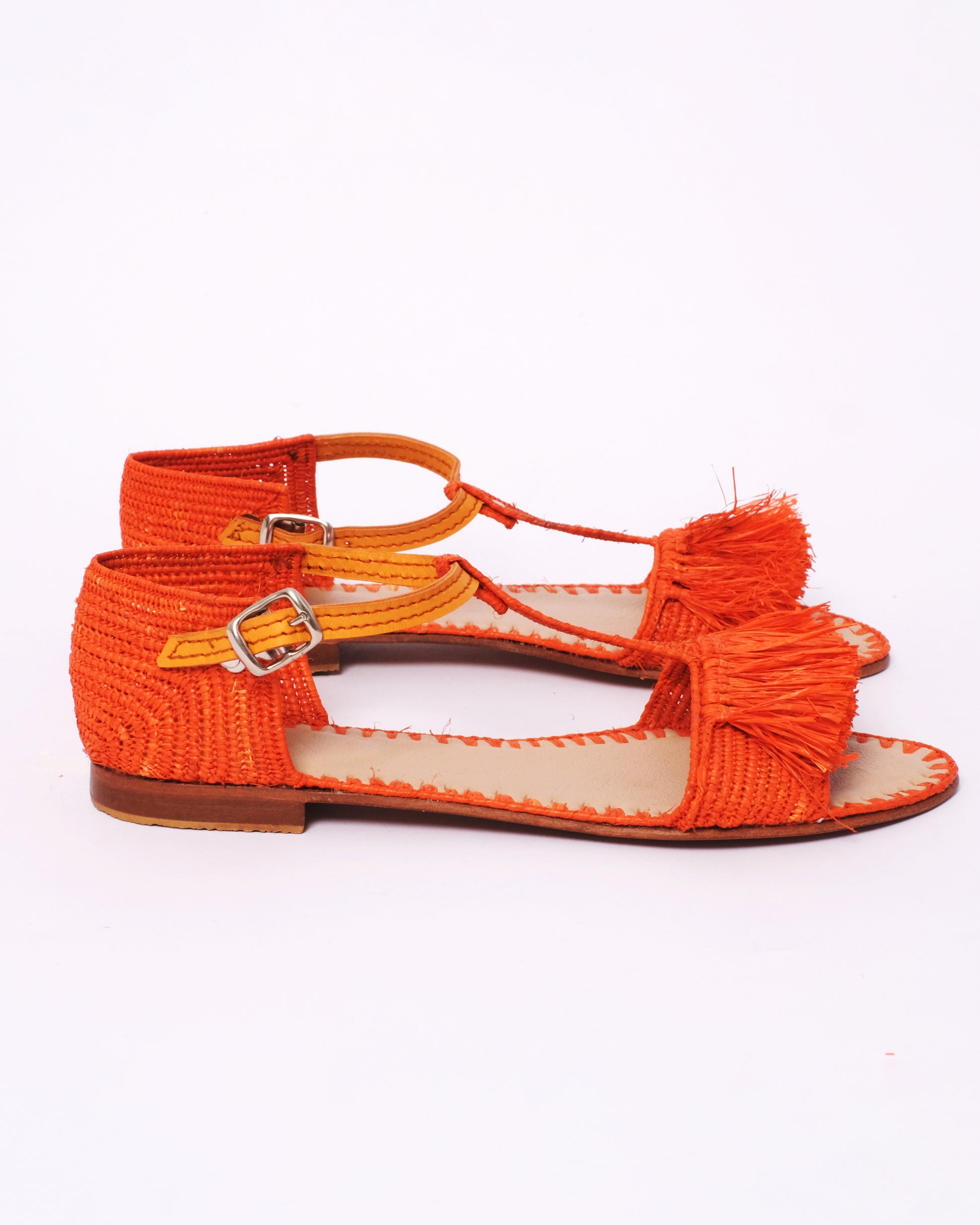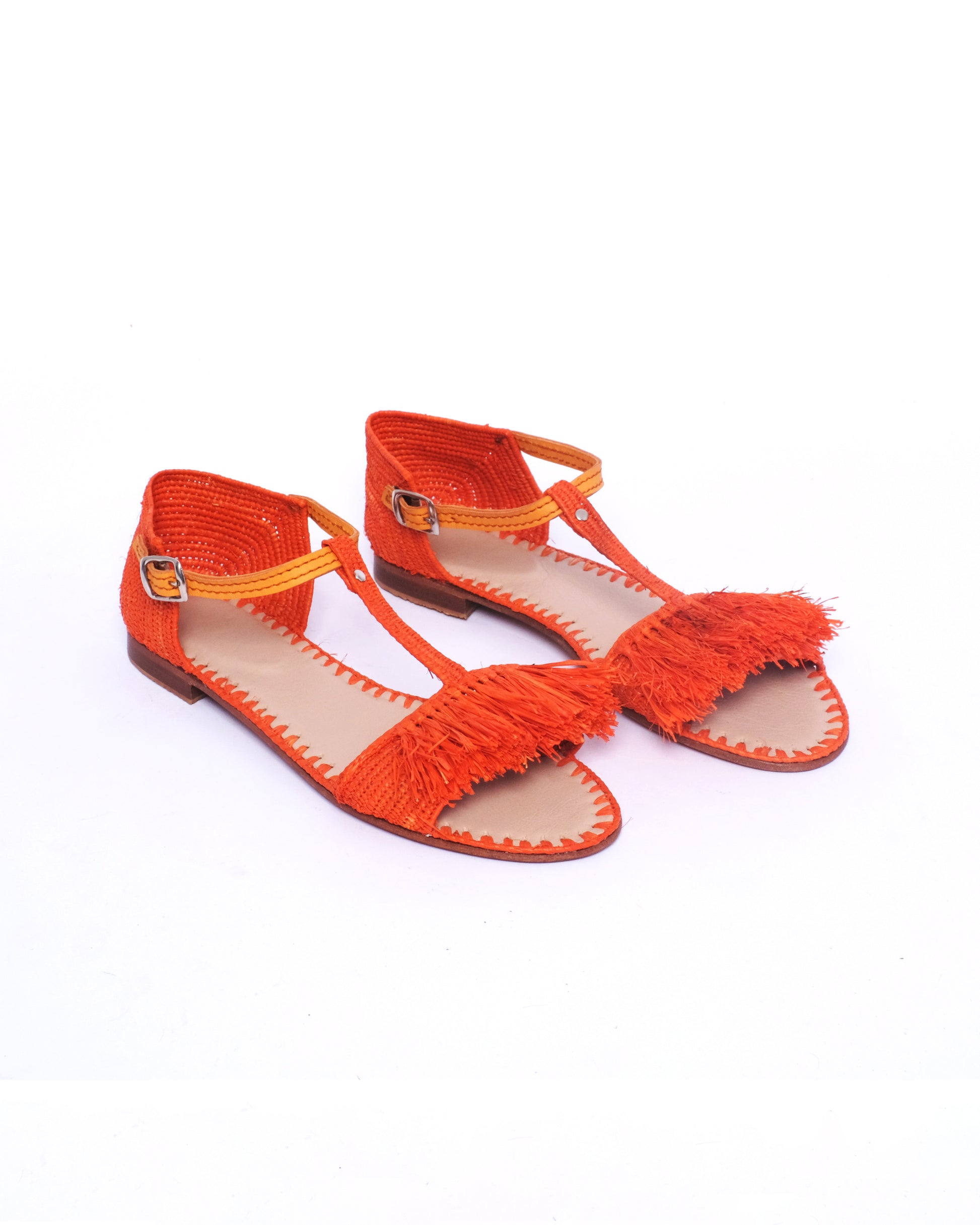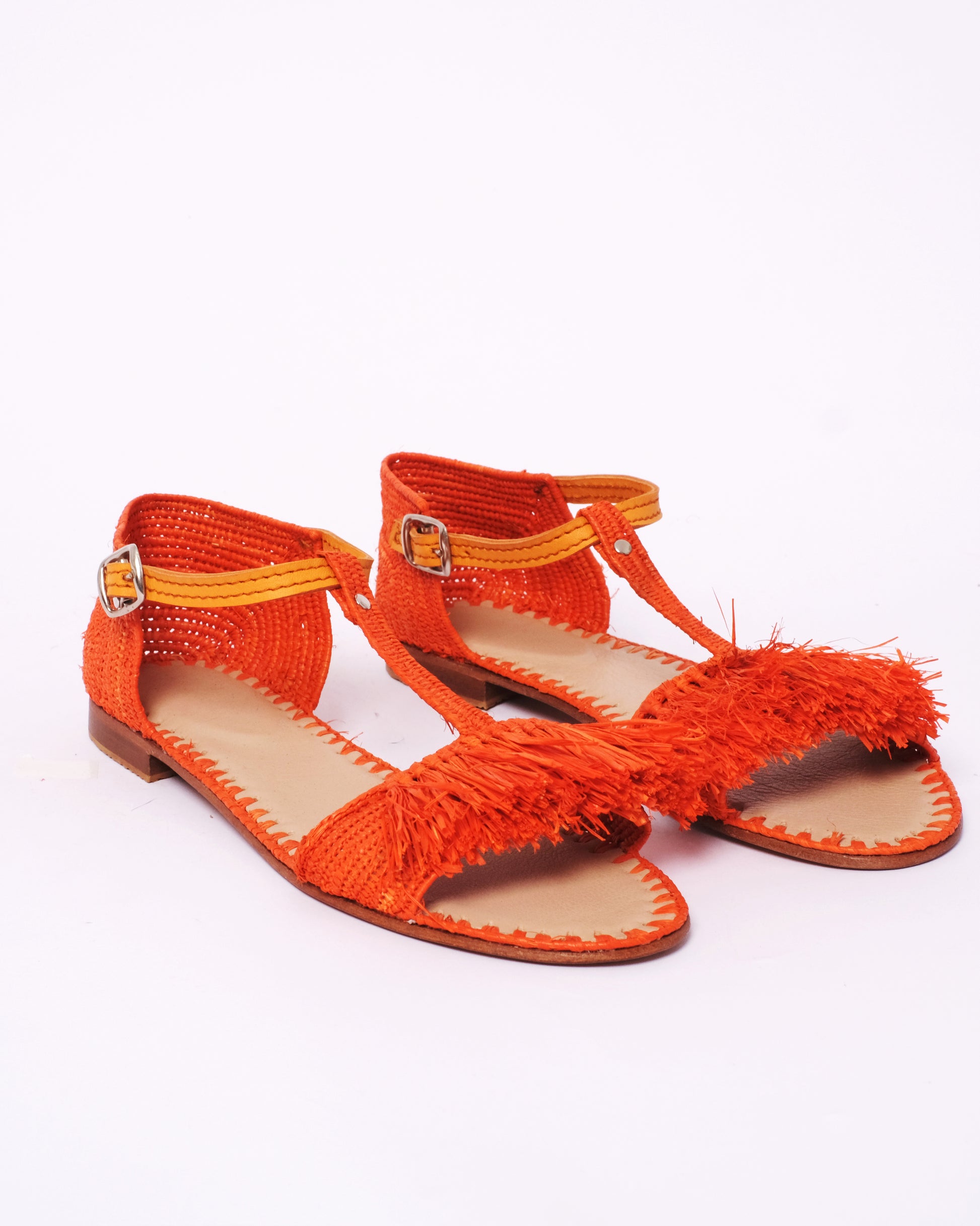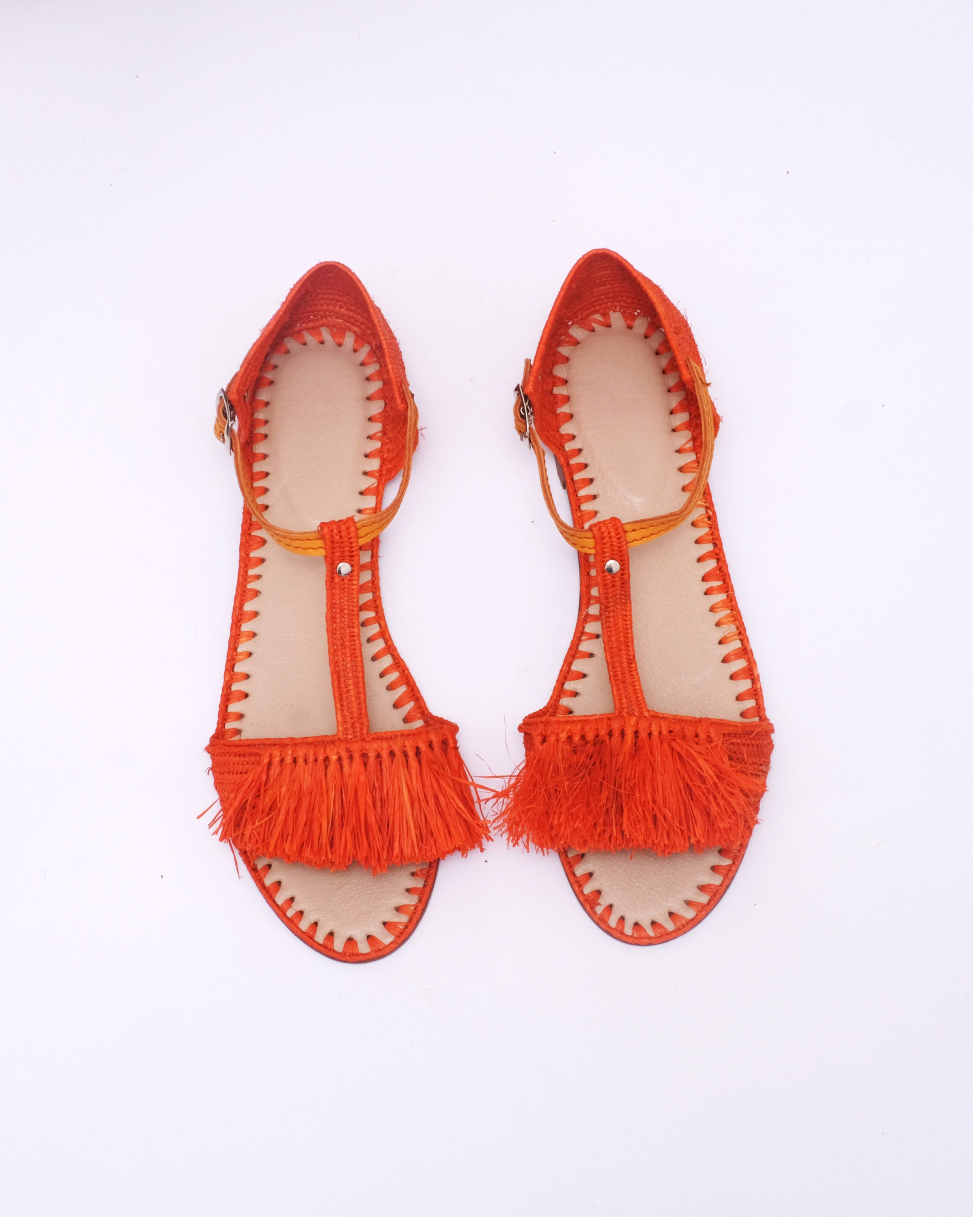 Women’s Orange Raffia Sandals – Handmade Fringe Design